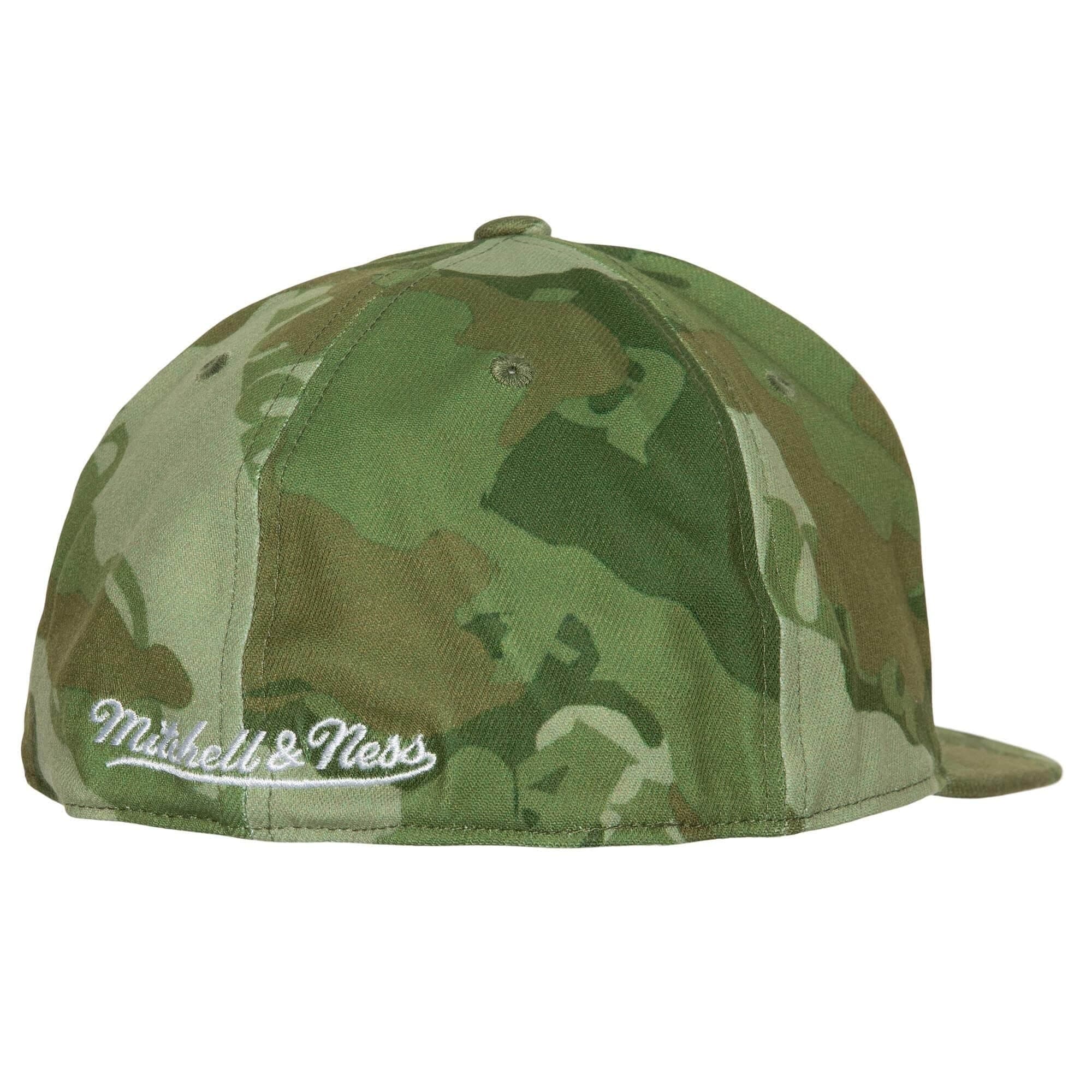 Камуфляжная бейсболка Mitchell & Ness Ghost Camo Stretch Fitted HWC Atlanta Hawks Hat в ретро-стиле имеет  вышитый логотип команды в виде ястреба, бренда Mitchell & Ness и прямой козырек для максимального стиля.