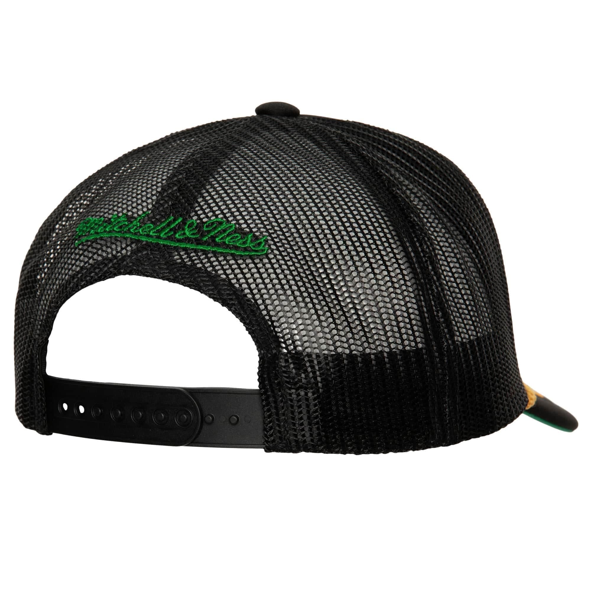 Черная бейсболка с сеткой Mitchell & Ness Gold Leaf Trucker HWC Dallas Mavericks Hat в ретро-стиле имеет застежку-защелку сзади для регулировки, вышитый логотип команды Mavs, логотип бренда Mitchell & Ness сзади и загнутый козырек с золотыми листьями для максимального стиля. Бейсболка выполнена из полиэстера с зеленой нижней частью козырька.- Цвет: Черный