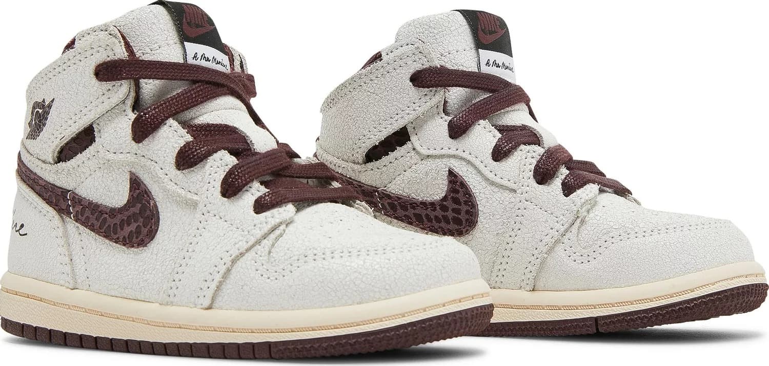 Модель A Ma Maniére x Air Jordan 1 High OG TD 'Airness', созданная в сотрудничестве с бутиком из Атланты, придает классическому силуэту роскошный вид. Текстурированная замша цвета слоновой кости использована в верхней части, подкладка из стеганого бордового текстиля и акцентирована бордовыми деталями из змеиной кожи на Swoosh и высоком воротнике. Сочетающиеся по цвету элементы брендинга включают тканый язычок Nike, ретро-логотип Wings на боковом воротнике и надпись "A Ma Maniére" на накладке на пятке. Кроссовки опираются на резиновую подошву с винтажными боковыми стенками и бордовой резиновой подметкой.