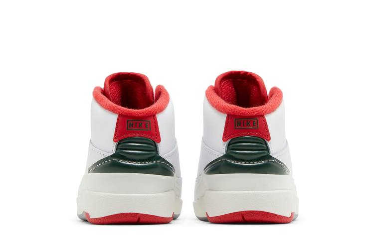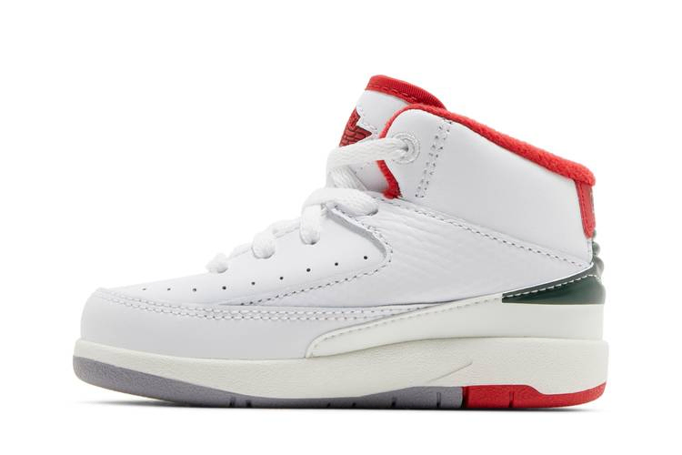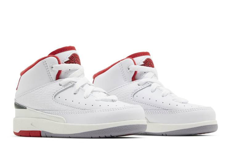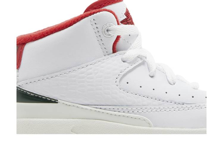 Уменьшенная для маленьких ножек модель Air Jordan 2 Retro TD "Origins" выполнена в характерной палитре, напоминающей о дебюте модели в 1986 году. (Оригинальные AJ2, заметно отличавшиеся от предшественников, сочетают в себе элегантный дизайн без Swoosh и мастерство итальянских мастеров). Унаследованный от прошлого силуэт имеет белый кожаный верх с накладкой из ящерицы на средней части стопы с красными и зелеными вставками. Последний оттенок повторяется на заднике, а огненно-красные акценты присутствуют на внутренней подкладке, заднике с логотипом Nike и ретро-логотипе Wings на язычке. Промежуточная подошва из мягкого пеноматериала имеет белую отделку, что придает кроссовкам винтажный вид.