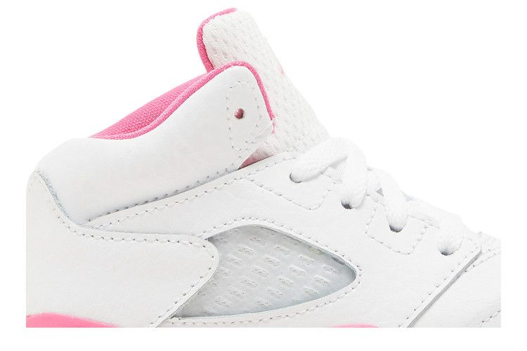 Модель Air Jordan 5 Retro TD "Pinksicle" отличается уменьшенным размером и летним сочетанием цветов. Верх выполнен из белой кожи с полупрозрачной сеткой на четверти и мягким воротником из розового текстиля. Розовые логотипы Jumpman украшают сетчатый язычок и заднюю часть пятки. Пастельный оттенок повторяется в межподошве из пеноматериала, украшенной оранжевыми деталями в виде акульих зубов, и поддерживается подошвой, сцепляющейся с поверхностью в виде елочек.