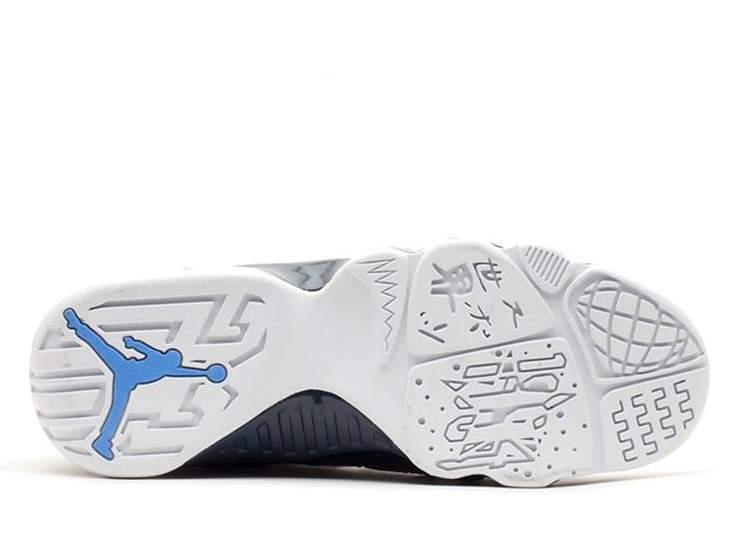 Модель Air Jordan 9 Retro Low Blue Pearl GS с низким верхом. Обувь включает внутреннюю схему поддержки ботинок с использованием белой кожи, которая контрастирует с жемчужно-синими акцентами на брызговике, мидсоли и воротнике. На подошве выгравирована серия фраз на разных языках.- Цвет: White/Blue Pearl
