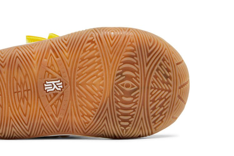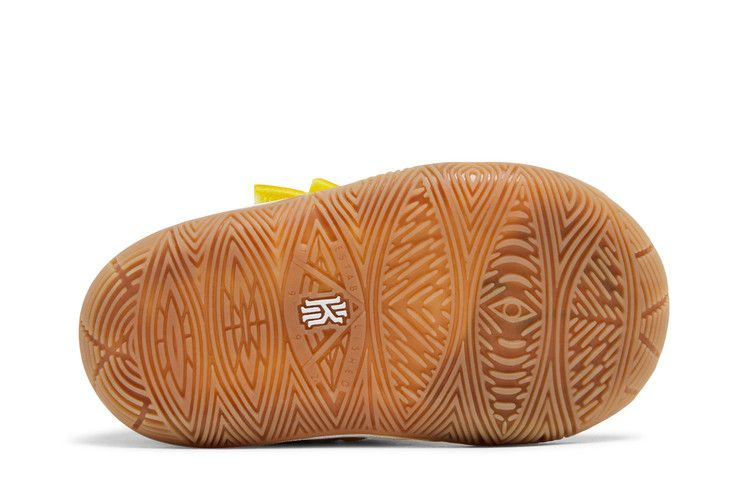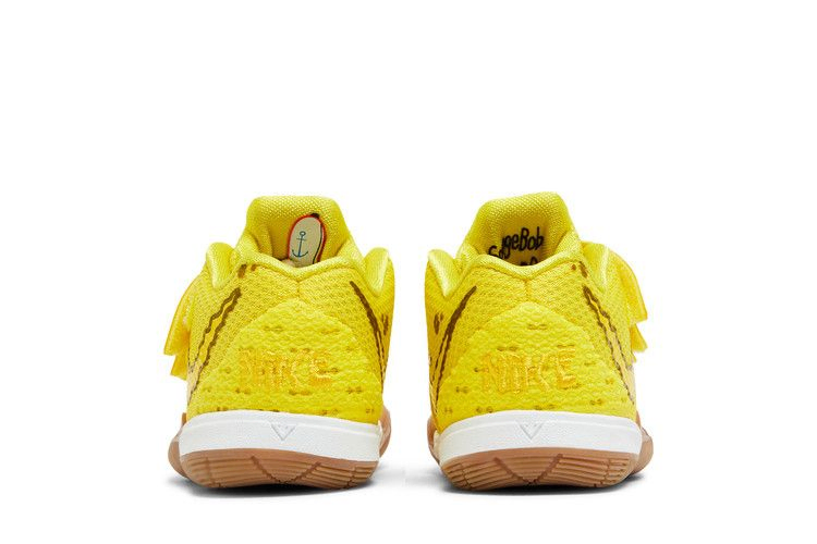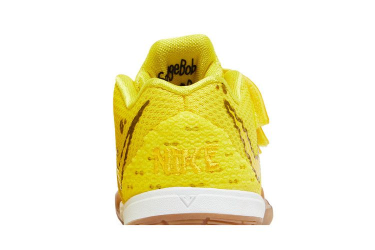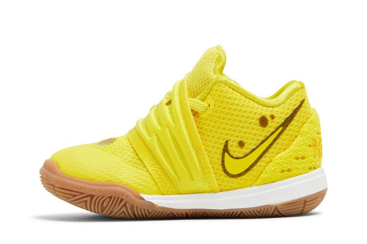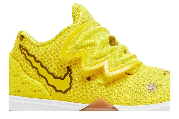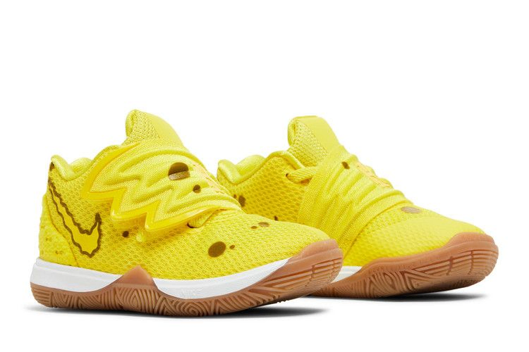 Модель SpongeBob SquarePants x Nike Kyrie 5 TD 'SpongeBob', входящая в комплект из пяти штук, - это кивок в сторону любви Кайри Ирвинга к культовому мультфильму. Этот детский вариант, представленный в сентябре 2019 года, изображает титулованного персонажа в желтой сетке с загогулиной Swoosh и соответствующим покрытием шнурков. Его лицо напечатано на стельке, а логотип вышит на пятке. Подошва из вспененного материала и резиновая подошва имитируют фирменную одежду главного героя.
