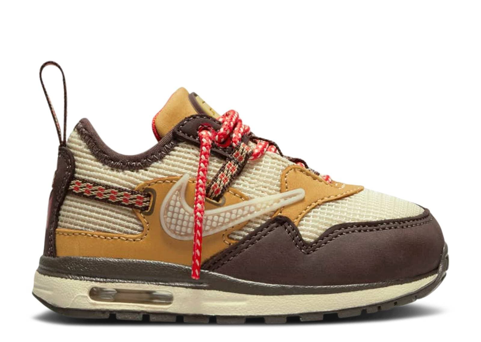 Travis Scott x Nike Air Max 1 TD "Baroque Brown" - это уменьшенная версия ретро-кроссовок с дизайнерским почерком хьюстонского рэпера. Кроссовки выполнены в утилитарном стиле, вдохновленном моделью ACG Pocket Knife, и имеют сетчатый верх кремового цвета с декоративными ремешками из тесьмы и усиленными накладками из кожи и коричневого нубука. Фирменный логотип Скотта Swoosh на задней стороне украшает боковую панель, а логотип Cactus Jack красуется на язычке. Промежуточная подошва из пеноматериала обеспечивает видимую амортизацию Air-sole под пяткой для плавного хода.- Цвет: Baroque Brown/Lemon Drop/Wheat/Chile Red