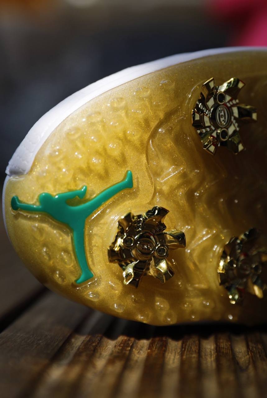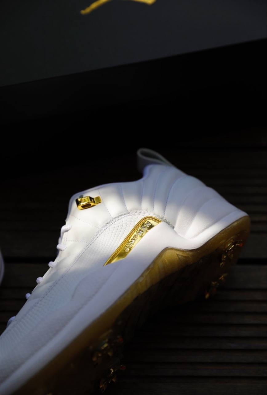 Air Jordan 12 Low Golf 'Masters' обновляет чемпионские кроссовки Майкла Джордана с измененной конструкцией, предназначенной для игры на зеленом, а не на твердом покрытии. Верхняя часть из белой кожи демонстрирует лучистые прошитые линии оригинальных Air Jordan 12, а также прочный брызговик с текстурой ящерицы и литые верхние люверсы цвета золотого металлика. Соответствующие позолоченные акценты расположены на средней части стопы и вышитом брендинге Jumpman на язычке. Легкая амортизация обеспечивается мидсолью из вспененного материала с поддержкой Air, а подошва из полупрозрачной резины с семью съемными золотыми шипами завершает дизайн.- Цвета: White/Metallic Gold/Malachite/White