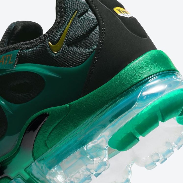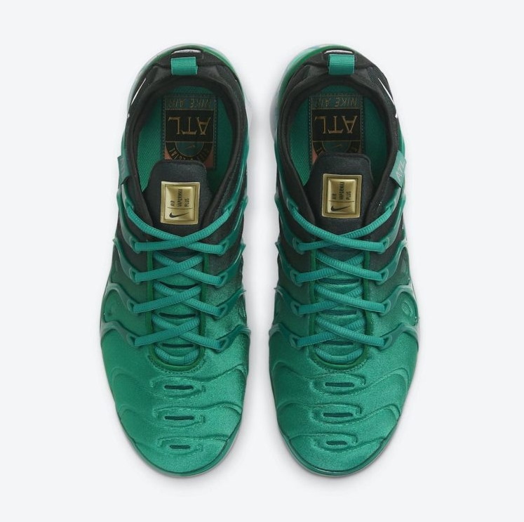 Запущенный в рамках серии «City Special», релиз Nike Air VaporMax Plus «Атланта» отдает дань уважения столице Джорджии. Градиентная смесь черного и мистического зеленого выполнена на текстильном верхе, который покрыт накладками из ТПУ и подчеркнут металлическим золотым Swoosh. Соответствующие золотые надписи ATL начертаны на тканой бирке, прикрепленной к боковому воротнику. Верхняя часть Air Max Plus установлена на подошве, которая находится на прозрачном блоке VaporMax.- Цвета: Mystic Green/Black/Metallic Silver/Metallic Gold