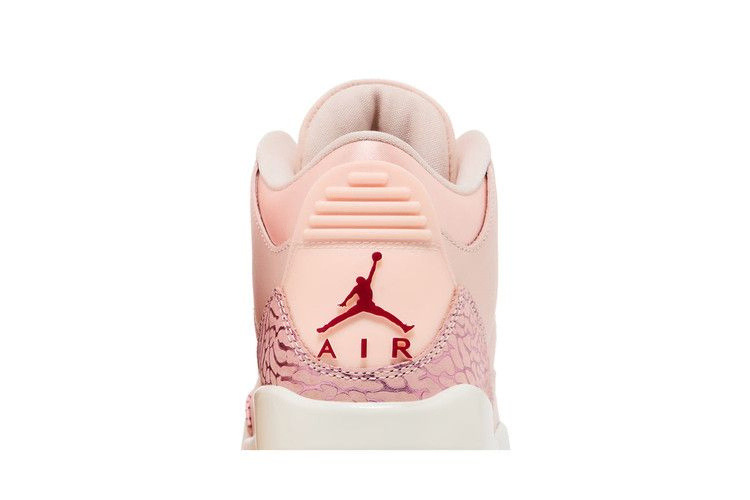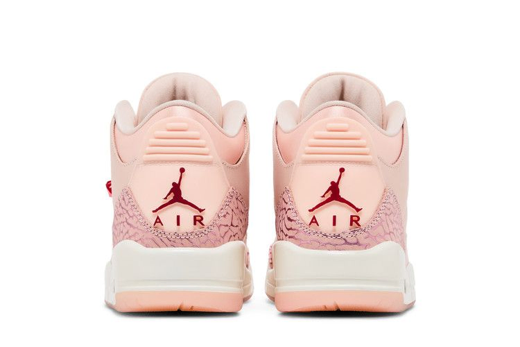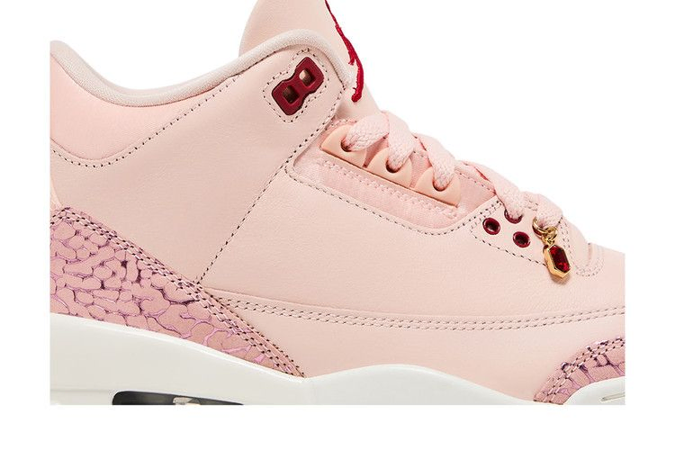 Женские Air Jordan 3 Retro "Treat Yourself", также известные как "Valentine's Day", демонстрируют верхнюю часть из галтованной кожи цвета Washed Coral с тональными накладками с принтом слона на носочной и пяточной частях. Литые люверсы выполнены в красном цвете, что соответствует брендингу Jumpman, украшающему язычок и пятку. Амортизация выполнена в виде белой полиуретановой подошвы с видимым блоком Air-sole в пятке. Розовая полупрозрачная резиновая подошва обеспечивает надежное сцепление с поверхностью.