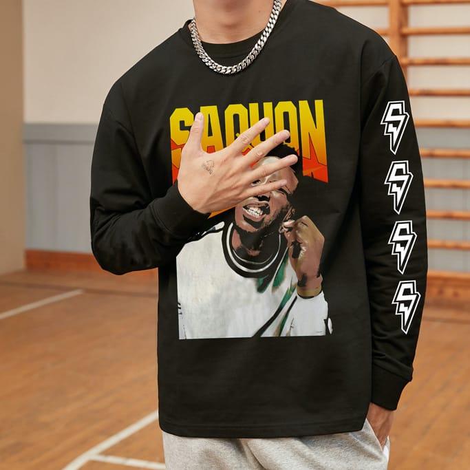 Лонгслив Ehot Saquon Black Longsleeve черного цвета со спущенными плечами украшен цветным принтом с изображением игрока в американский футбол Саймона Баркли. Лонгслив из мягкой ткани обладает свободным кроем. Одежда прекрасно подходит для тренировки или прохладной погоды.
