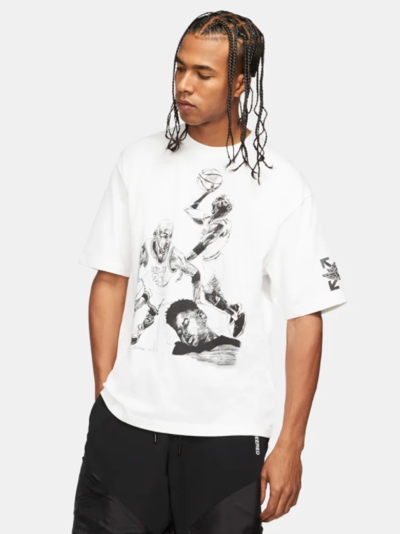 Футболка OFF-WHITE x Jordan T-Shirt White сделанная из лёгкого и дышащего хлопкового материала, имеет белую расцветку. Её выпустили 8 февраля 2021 года, почти через год после того как два бренда объединились в 2020 году. В результате на этой футболке спереди изображен молодой человек, мечтающий о Майкле Джордане. С другой стороны футболки история развивается, и теперь молодой человек мечтает о себе в образе Майкла Джордана, с логотипом сверху Off-White.- Пол: мужской