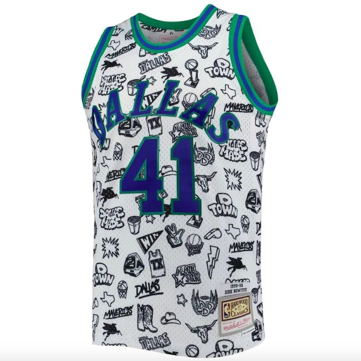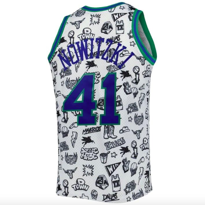 Заказать джерси 1998-99 Dallas Mavericks #41 Dirk Nowitzki Mitchell & Ness Doodle White Jersey с бесплатной доставкой.