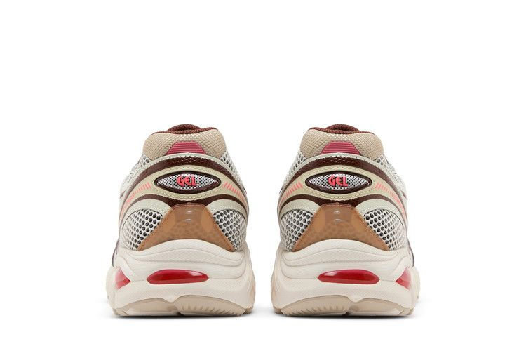 Модель Above The Clouds x ASICS GT 2160 'Chocolate Brown' вдохновлена японским кленовым деревом осенью. Верхняя часть кроссовок выполнена из смешанных материалов: белой сетки с открытыми ячейками и полупрозрачных текстильных панелей. Серебристо-металлические боковые полоски окантованы коричневой окантовкой, сочетающейся с текстильной подкладкой воротника и мыском из искусственной кожи. Легкая амортизация обеспечивается белой промежуточной подошвой EVA с малиновыми вставками Gel в пятке.