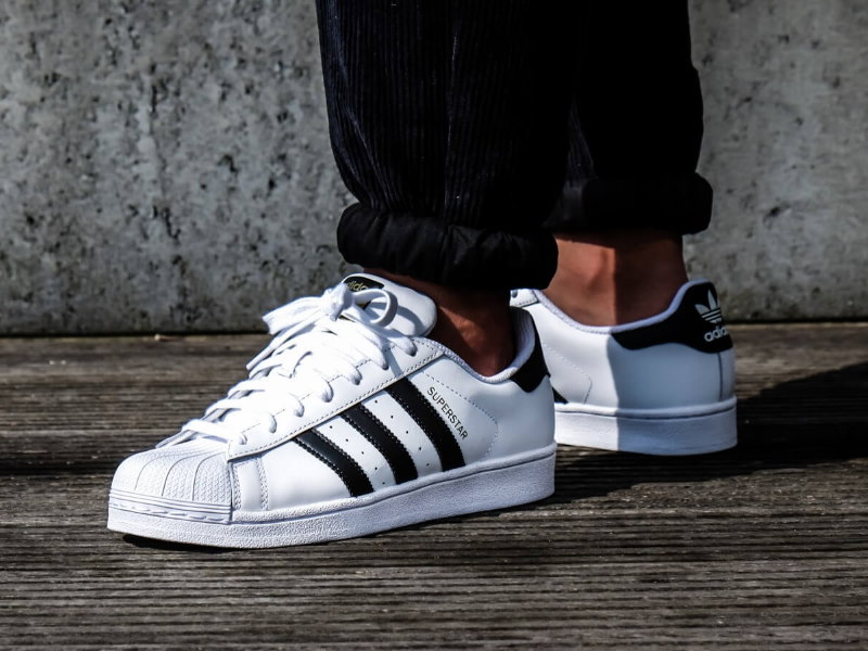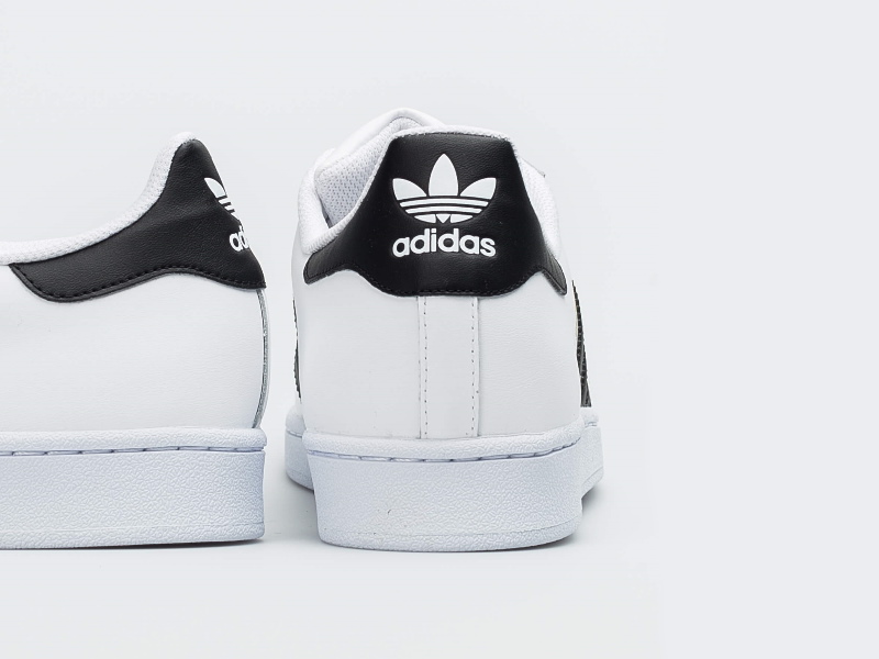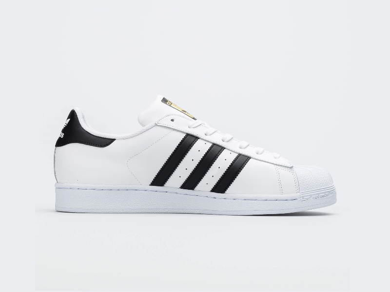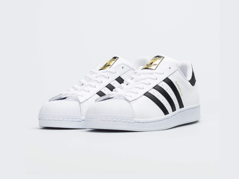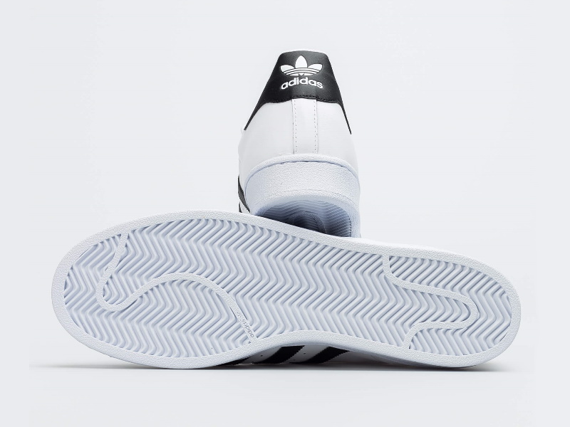 Adidas Superstar демонстрирующий классическую расцветку, выполненную на белом кожаном верхе из зернистой кожи и подчеркнутом черными зубчатыми кожаными полосами. Резиновый мысок, предназначенный для защиты - выполнен в белом цвете, как и шнурки и резиновая мидсоль. Черная кожаная петля на пятке украшена трилистником Adidas, а дополнительные акценты логотипа на язычке и четвертичной панели украшены блестящей золотой фольгой.- Цвета: Cloud White/Core Black/Cloud White