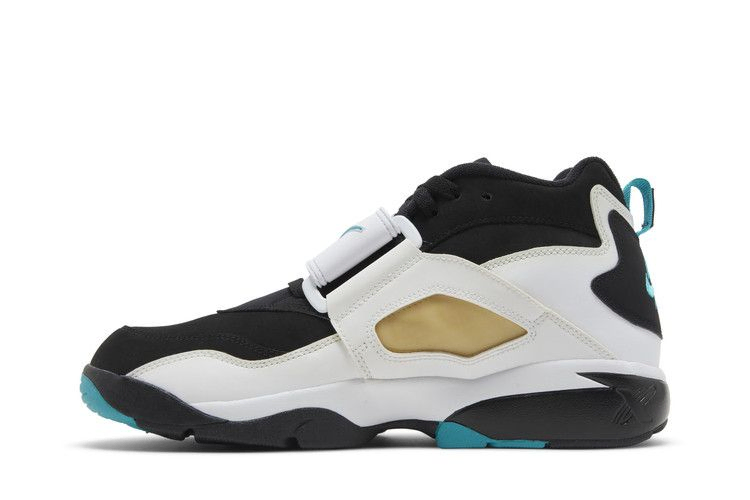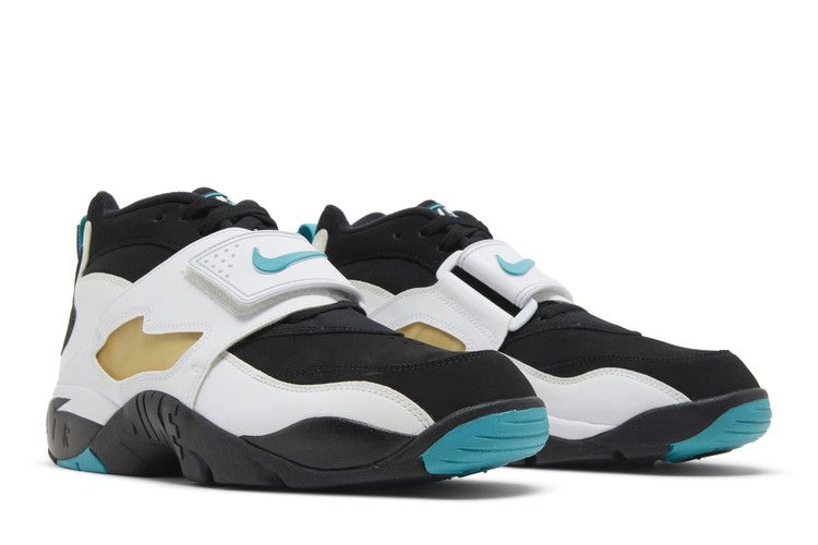 Изначально Air Diamond Turf были созданы для футболистов. В основном черно-белая расцветка кожаного верха, а в изумрудной версии для контраста использованы акценты Deep Emerald на подошве и брендинге. Средняя часть верха кроссовок работает в унисон с ремешком на передней части стопы для устойчивости.