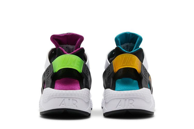 Nike Air Huarache "Peace, Love, Swoosh" возвращают культовые минималистичные беговые кроссовки в ярких цветах с драгоценными камнями. Верхняя часть из белой искусственной кожи с черным неопреновым носочным блоком и внутренними ботинками разных цветов, с ярко-телесным оттенком на правом ботинке и пурпурным - на левом. Символ мира, сердечко и Nike Swoosh украшают черную среднюю часть стопы, которая оснащена оранжевыми и зелеными полупрозрачными ремешками на пятке. Легкая амортизация обеспечивается благодаря промежуточной подошве Phylon с амортизацией Nike Air.