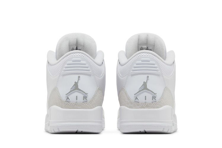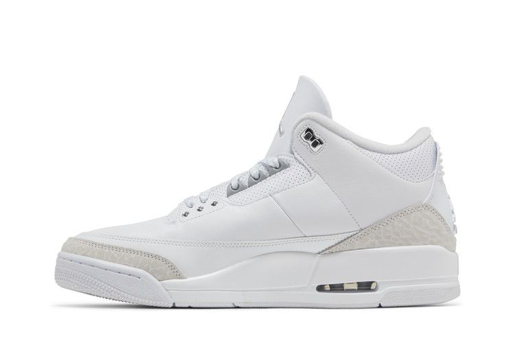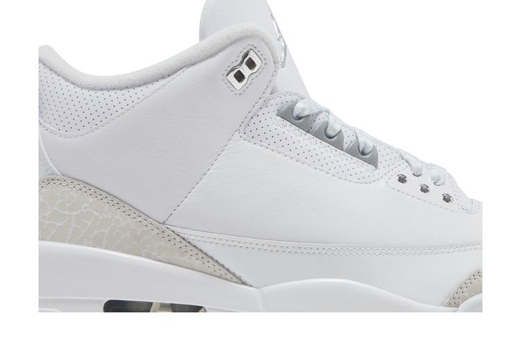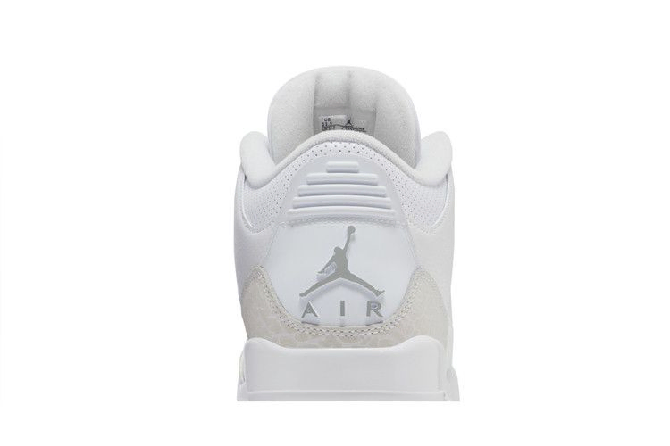В 2025 году Air Jordan 3 "Pure Money" вернулись к чисто-шиферной расцветке, дебютировавшей в 2007 году. Верхняя часть кроссовок выполнена из белой кожи с тональным слоновьим принтом на носочной и пяточной частях. Матовые серебристые акценты расположены на литых люверсах, а также на логотипе Jumpman, украшающем язычок и пятку. Легкая амортизация обеспечивается белой полиуретановой подошвой с видимым блоком Air-sole, расположенным в пятке.