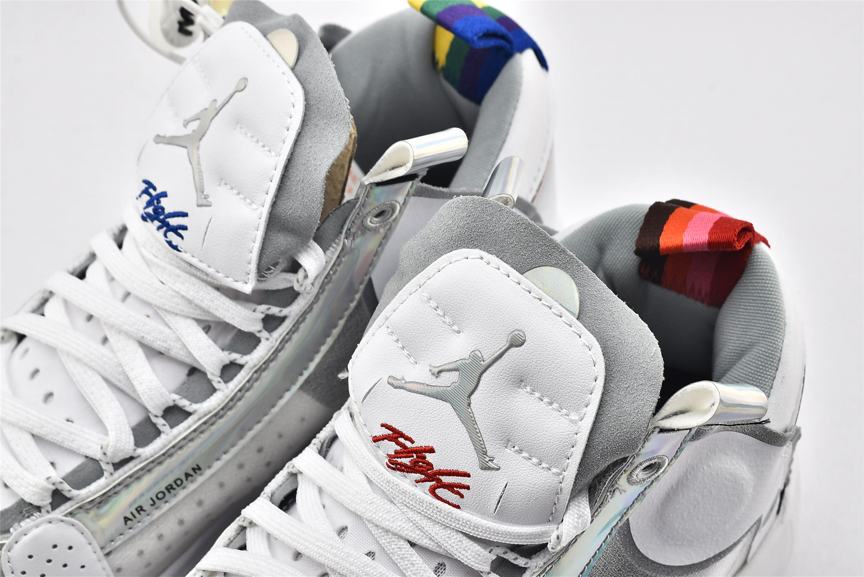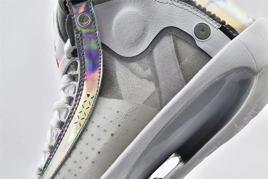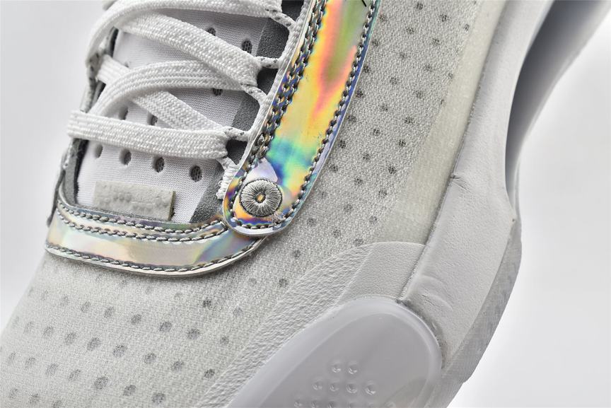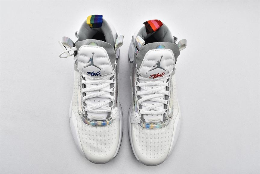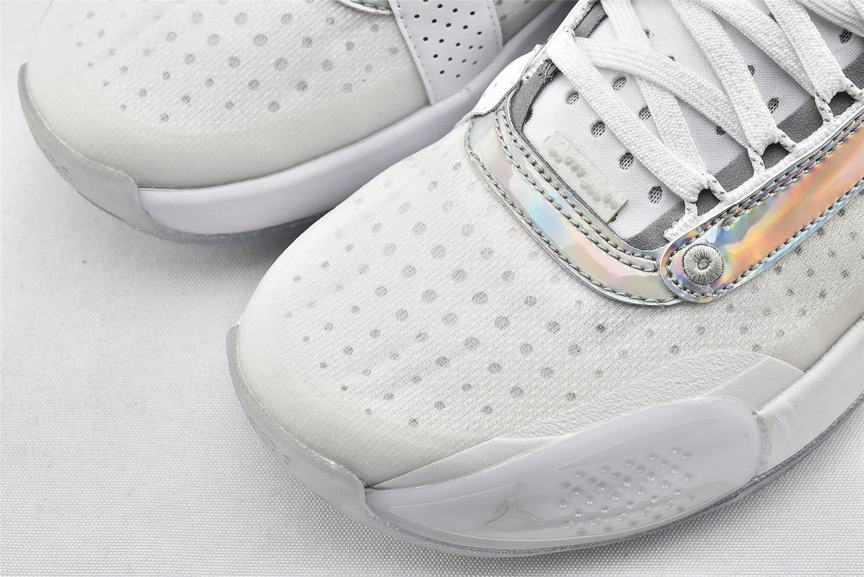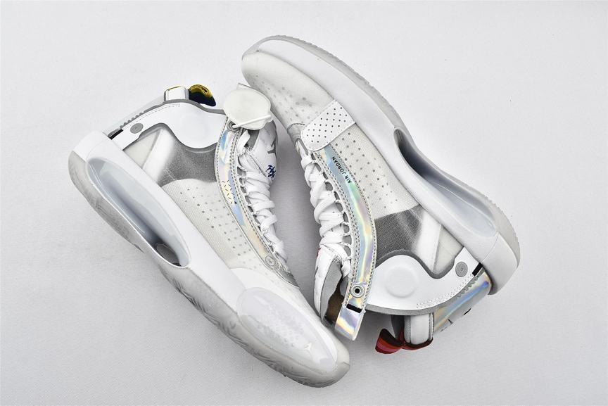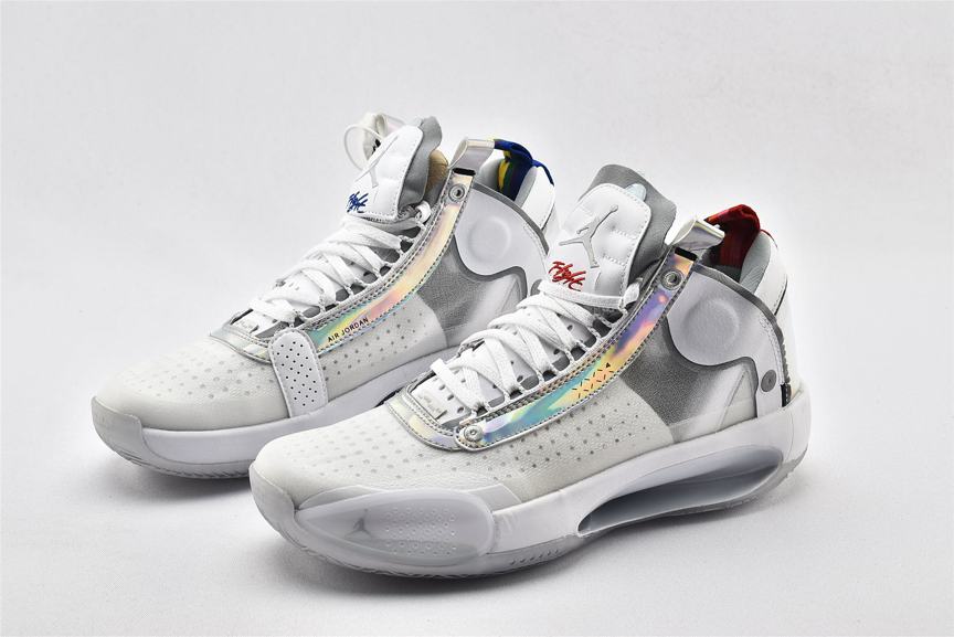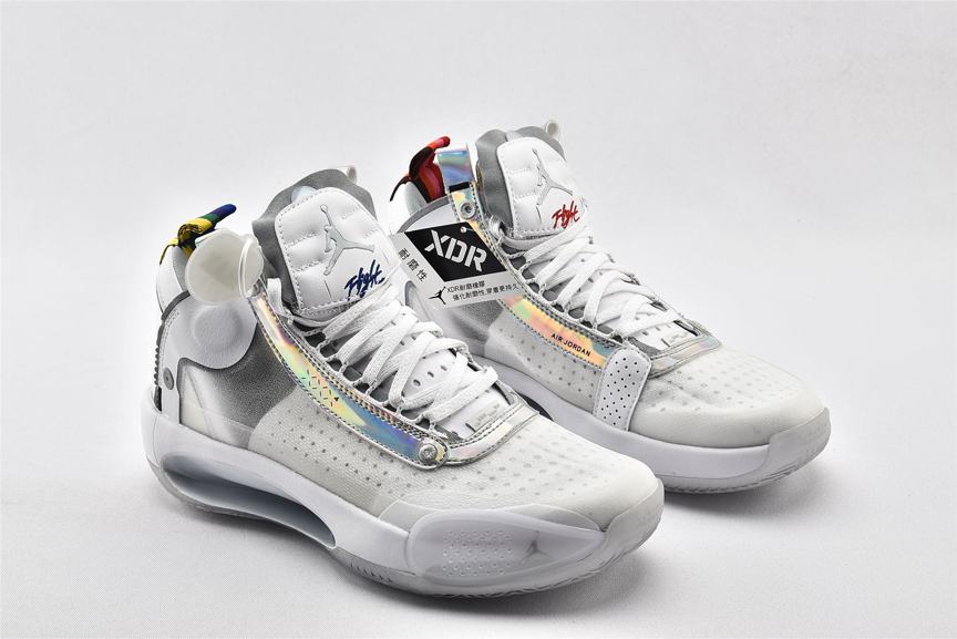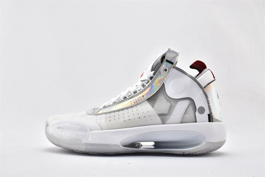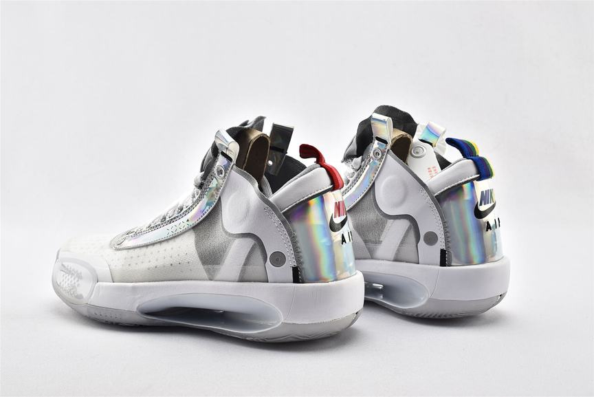 Модель Air Jordan 34 PF Unite демонстрирует переливающуюся отделку на оправе шнуровки и на панели пятки, а также виден логотип Nike Air на левом и правом кроссовке. Остальная часть верха изготовлена из белой синтетической кожи и полупрозрачного текстиля, поддерживаемой мидсолью, которая сочетает в себе пластину Eclipse с видимым Zoom Air для сверхчувствительной амортизации. Резиновая подошва с рисунком «елочка» для превосходного сцепления.- Цвета: White/Metallic Silver/White