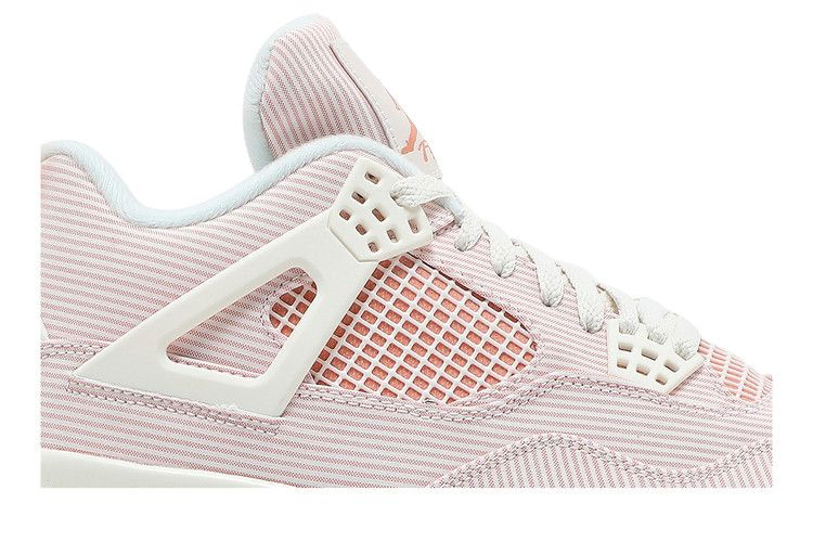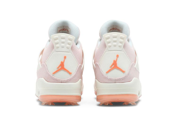 Модель Air Jordan 4 Golf NRG 'Seersucker' имеет летний дизайн, вдохновленный традиционным южным пошивом, особенно теми костюмами с рюшами, которые каждый год можно увидеть на Кентуккийском дерби. Эти обновленные Air Jordan 4 имеют верхнюю часть в виде белых и розовых полос. Белоснежный парус украшает литые люверсы, структурные крылья и вшитый пяточный язычок, на котором изображен рельефный логотип Jumpman цвета абрикосового агата. Кроссовки стоят на пенопластовой подошве с видимым блоком Air-sole в пятке и поддерживаются полупрозрачной подошвой со съемными шипами для оптимального сцепления.