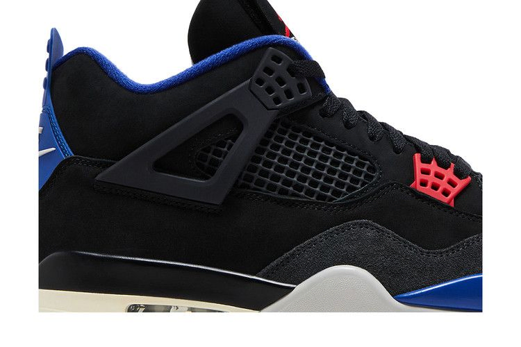 В модели Air Jordan 4 Retro 'Rare Air - White Lettering' используется верх из черного нубука с сеткой на четверти, крыльями поддержки из TPU и литыми люверсами в черном и огненно-красном цветах. Верхняя часть выполнена из контрастной белой строчки, а передняя часть укреплена серой замшей. Воротник отделан текстилем королевского синего цвета, а на пятке расположен фирменный знак Nike Air. Сменные нашивки на липучках украшают язычок, а логотип Rare Air украшает носок. Кроссовки оснащены полиуретановой промежуточной подошвой с поддержкой Air, на которую нанесен цветовой акцент королевского синего цвета и черные вставки вокруг пятки.