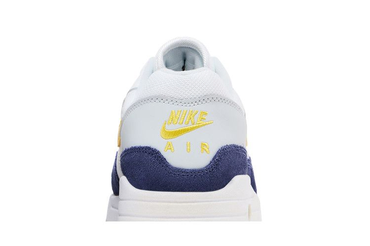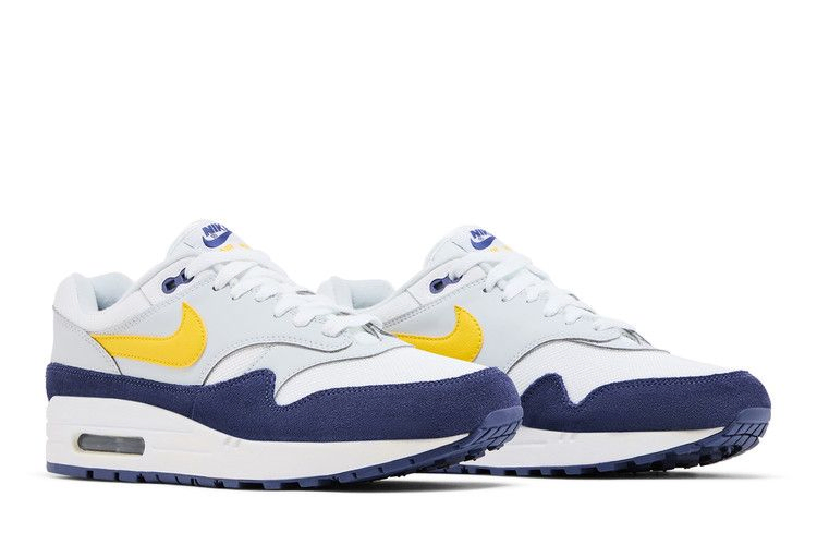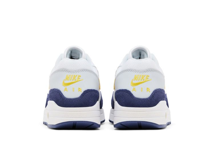 Вдохновленные цветами команды Мичиганского университета "Росомахи", классические кроссовки Air Max 1 "Blue Recall", разработанные Тинкером Хэтфилдом в 1987 году, получили новое воплощение. Модель выполнена из белой сетки с накладками из искусственной кожи серого и желтого цветов. Солнечно-желтые детали Swoosh контрастируют с брызговиком Blue Recall, который проходит вокруг стопы и сочетается с синим блоком Air и резиновой подошвой кроссовка.