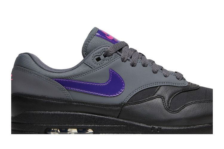 Первый силуэт Air Max, разработанный Тинкером Хэтфилдом, Nike Air Max 1 получил элегантное обновление с яркими цветами в модели "Fierce Purple". Кроссовки изготовлены из кожи, нейлона и холста рипстоп. Верх кроссовок темно-серого цвета с металлическими акцентами Fierce Purple на язычке и брендинге Swoosh и Pink Blast. Кроссовки имеют черные матовые грязезащитные щитки, промежуточную подошву и подошву, а также видимый воздушный блок.