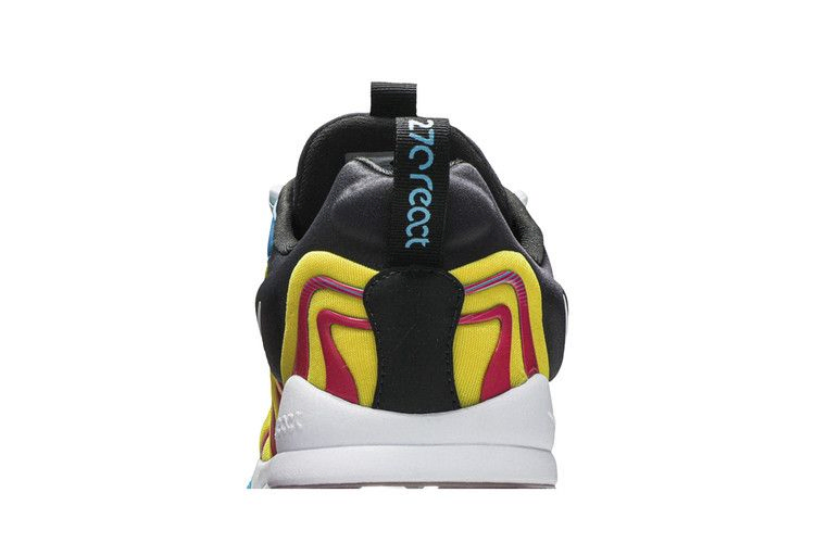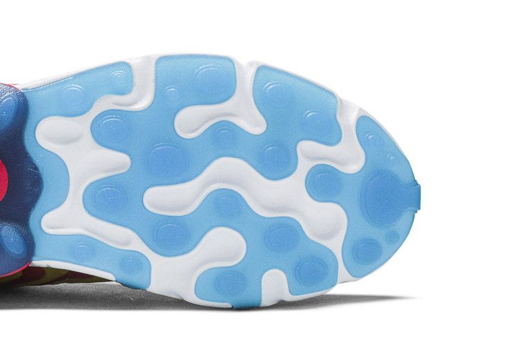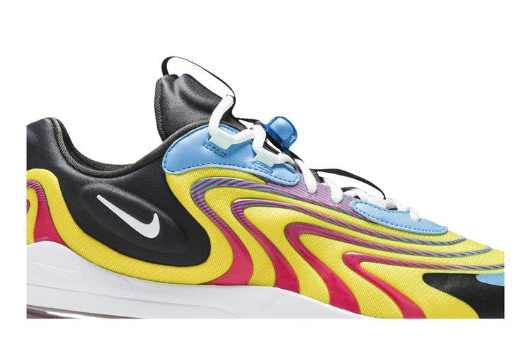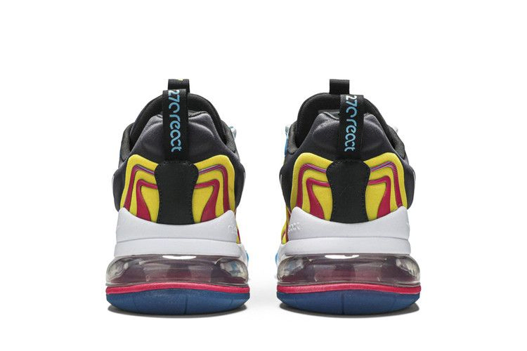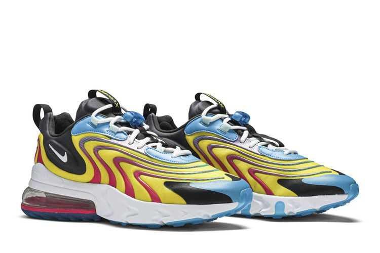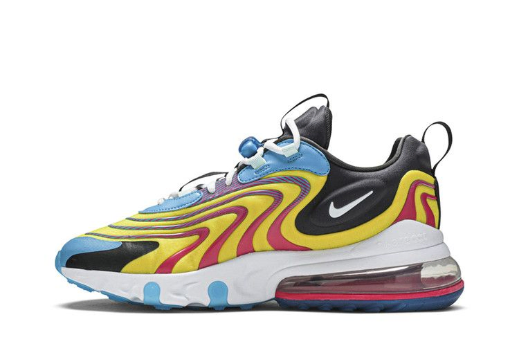 Модель Air Max 270 React ENG "Laser Blue" демонстрирует контрастные яркие оттенки в верхней части и на подошве. Последняя сочетает в себе белую межподошву из пеноматериала React и пяточный блок Max Air розового цвета, опирающийся на голубую полупрозрачную резиновую подошву. Эти же цвета использованы в желтом сетчатом верхе, оснащенном контурным воротником для удобной посадки и украшенном волнистыми накладками из TPU для динамичного вида.