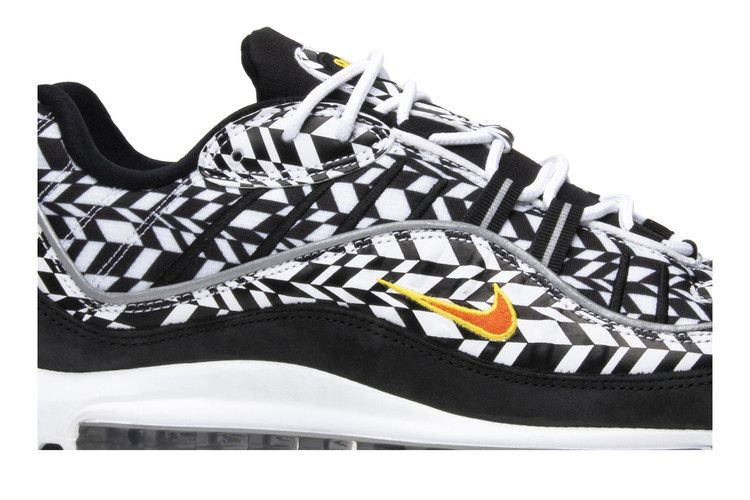 Модель Air Max 98 "All Over Print" сочетает в себе классическую эстетику 1970-х годов и современный элегантный дизайн. Модель украшена оранжевыми логотипами Swooshes на мыске и боковых сторонах, желтыми рисунками Air на пятке и язычке, белой подошвой, черной подошвой и светоотражающими элементами 3M.