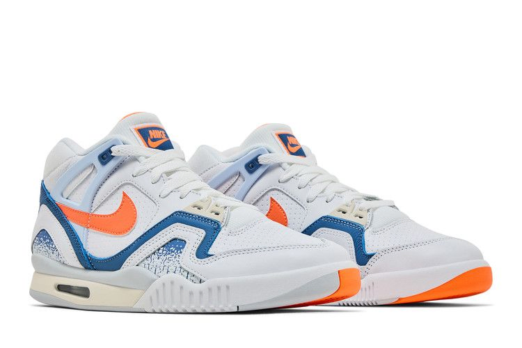 Выпуск 2025 года Nike Air Tech Challenge 2 "Stone Blue" возрождает фирменную расцветку Андре Агасси. Верх из белой кожи с мягким воротником среднего кроя украшен шиферной синей накладкой и принтом в виде брызг, подобранным по цвету. Оранжевый кожаный логотип Swoosh контрастирует с цветом. Ретро-силуэт опирается на легкую полиуретановую подошву с видимой амортизацией Air-sole в пятке.