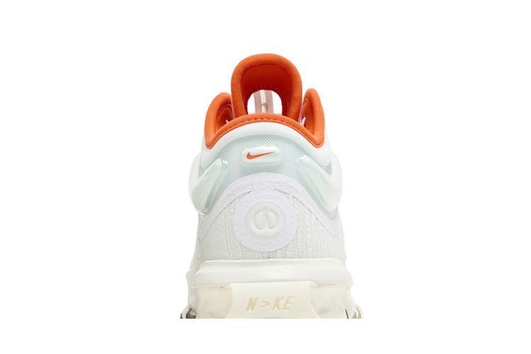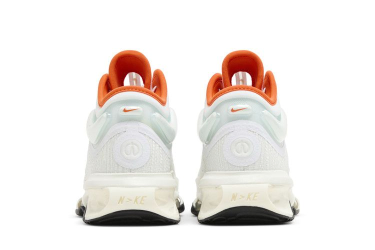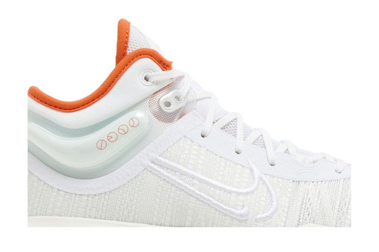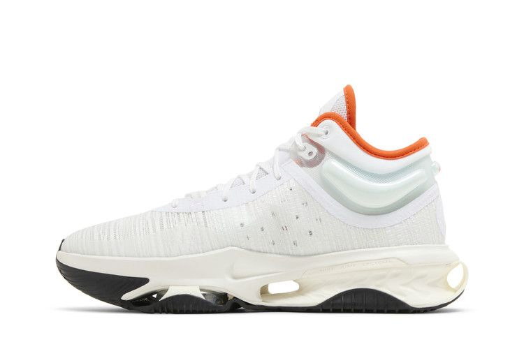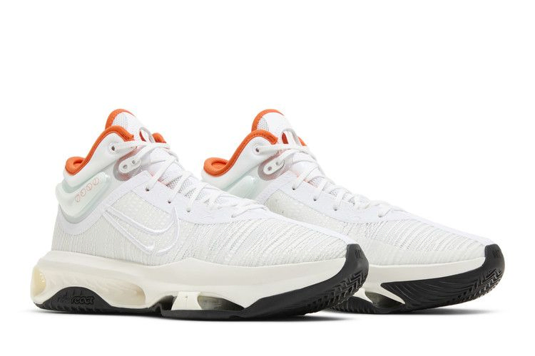 Модель Nike Air Zoom GT Jump 2 "Fresh" выполнена из белой сетки, украшена тональной вышивкой Swoosh и контрастным оранжевым цветом на внутренней стороне язычка и подкладке воротника. Амортизация включает в себя полноразмерную подошву Zoom Air Strobel, а также промежуточную подошву Phylon с пеной React в пятке и два блока Zoom Air в передней части стопы. Подошва из черной резины с рисунком "елочка" обеспечивает превосходное сцепление с поверхностью.