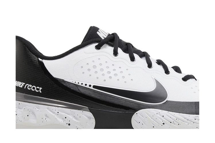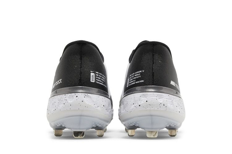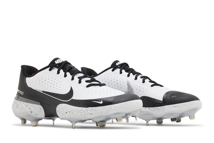 В модели Nike Alpha Huarache Elite 3 Low "White Black" универсальные бейсбольные бутсы выполнены в простой двухцветной цветовой гамме. Бесшовный белый текстильный верх с мягким воротником укреплен контрастными черными накладками для дополнительной прочности. Пенопластовые капсулы в пятке на внутренней подкладке обеспечивают повышенный комфорт и надежную посадку. Амортизация, как у кроссовок, обеспечивается промежуточной подошвой Nike React с текстурированными боковыми стенками в крапинку. Подошва, состоящая из двух частей, оснащена металлическими шипами, предназначенными для вгрызания в газон или грязь на поле.