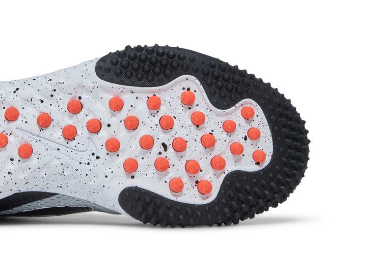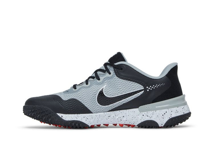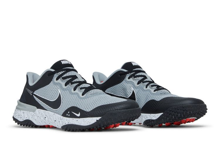 Nike Alpha Huarache Elite 3 Turf "Light Smoke Grey Black" представляет нейтральную расцветку легкой бейсбольной обуви, созданной с комфортом, как у кроссовок. Верхняя часть выполнена из дышащей серой сетки, дополненной контрастными черными накладками на носочной и пяточной частях. Низкие кроссовки установлены на пятнистую промежуточную подошву из пеноматериала Renew с текстурированными боковыми стенками для снижения веса. Подошва оснащена рядом красных резиновых шипов для максимального сцепления с поверхностью.