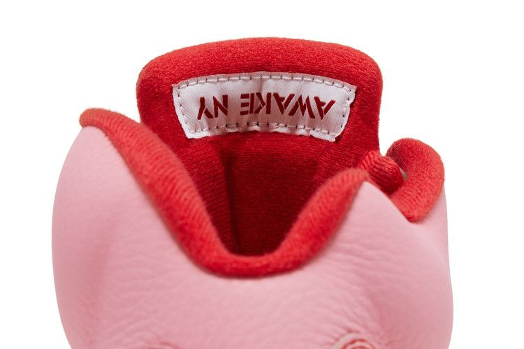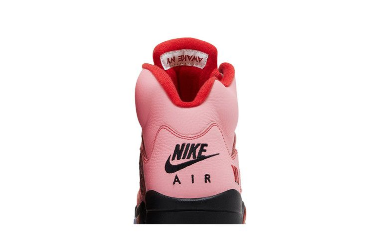 Awake NY x Air Jordan 5 Retro 'Boro - Arctic Pink' имеют верх из розовой кожи с контрастной строчкой и обновленными элементами брендинга. Среди них логотип Awake NY "A", интегрированный в сетку на четверти, а также малиновый Jumpman, расположенный поверх подобранного по цвету знака Awake, на серебристом светоотражающем язычке. Надписи "NY" и "23" вышиты на боковой пятке правого и левого ботинка соответственно. В качестве материала использована оригинальная расцветка "Fire Red", подчеркнутая черной полиуретановой подошвой с красными деталями в виде акульих зубов и полупрозрачной резиновой подошвой.