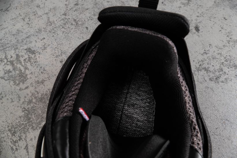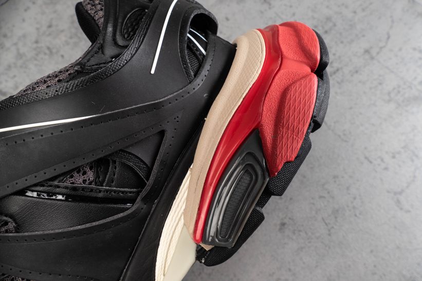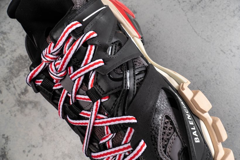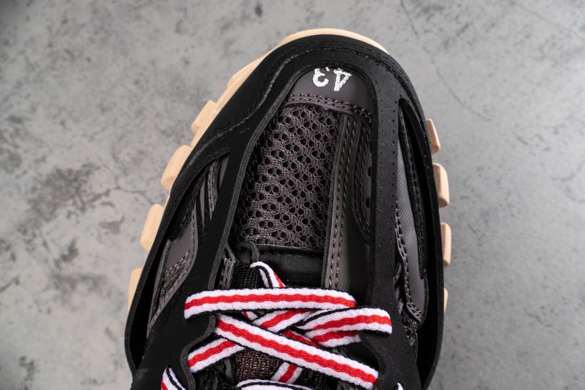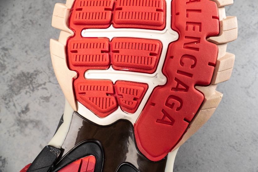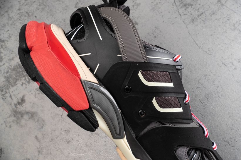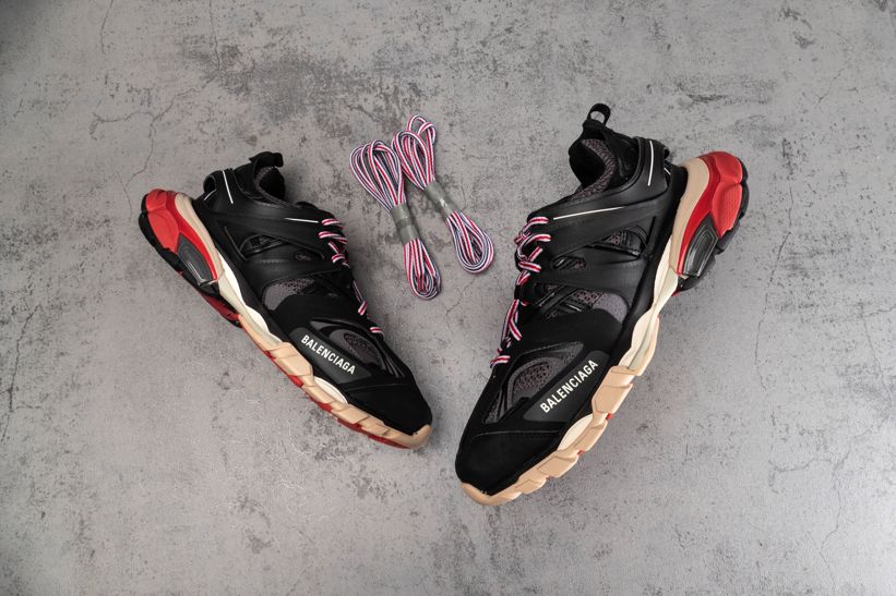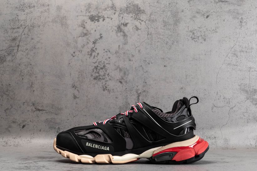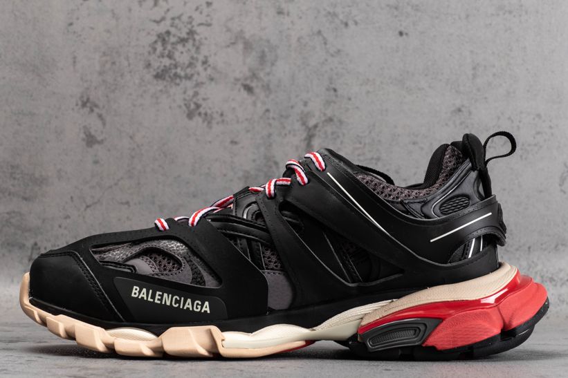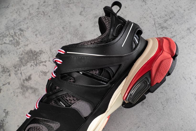 Кроссовки Track Trainer Black Red от Balenciaga оснащены несколькими высокотехнологичными компонентами, вдохновленными спортивной одеждой. Эта итерация, выпущенная в июле 2019 года, состоит из двух наборов трехцветных шнурков, интегрированных в многослойную черную сетку и верх из нейлона. Брендинг написан на передней части стопы и на языке, с проклейкой на носке.- Цвета: Black/Grey-Red