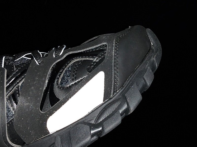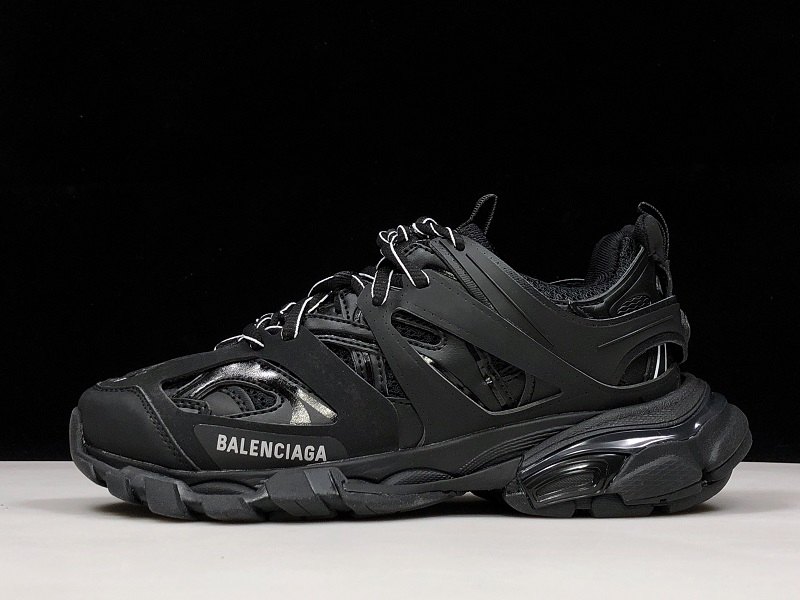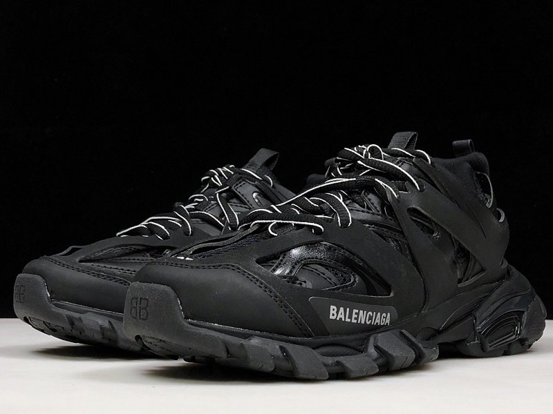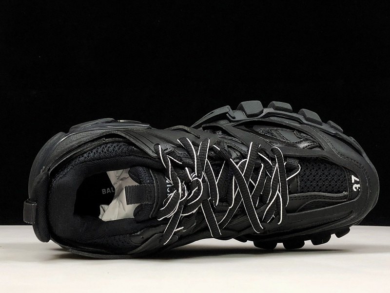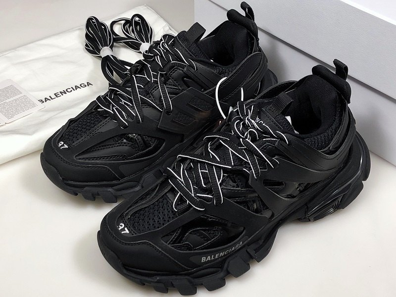 Расцветка кроссовок Balenciaga Track Trainer в тройном черном цвете, выпущенная в сентябре 2018 года, следует за своим предшественником в тяжелом стиле. Перекрывающие друг друга защитные нейлоновые панели закрывают верхнюю часть сетки, акцентируясь на ее европейском размере на носке. Они имеют толстую подошву, похожую на Triple S, но с увеличенной пяткой. Легендарный дом моды одевает обувь во все черное сверху вниз. Изделие поставляется с чехлом для хранения и коробкой Balenciaga.- Цвета: Black