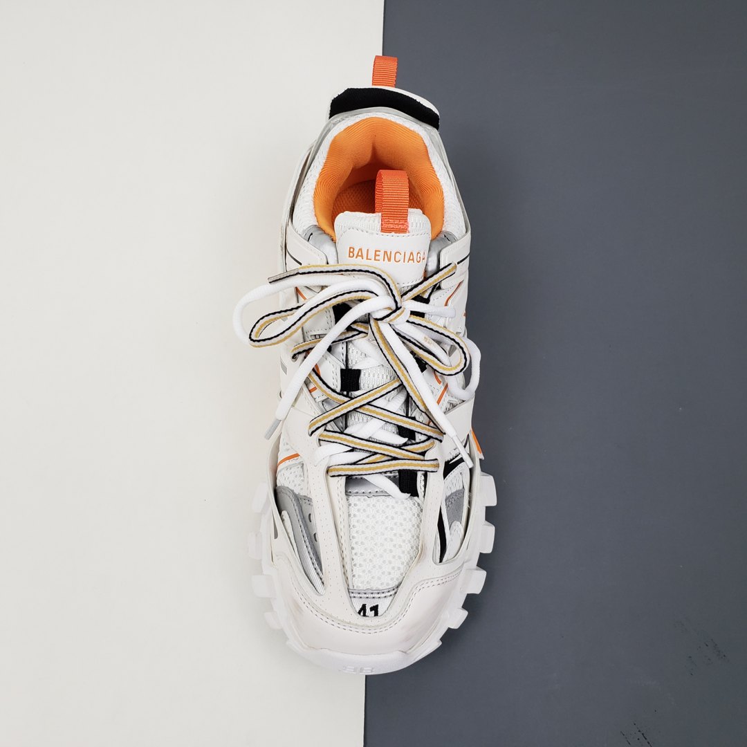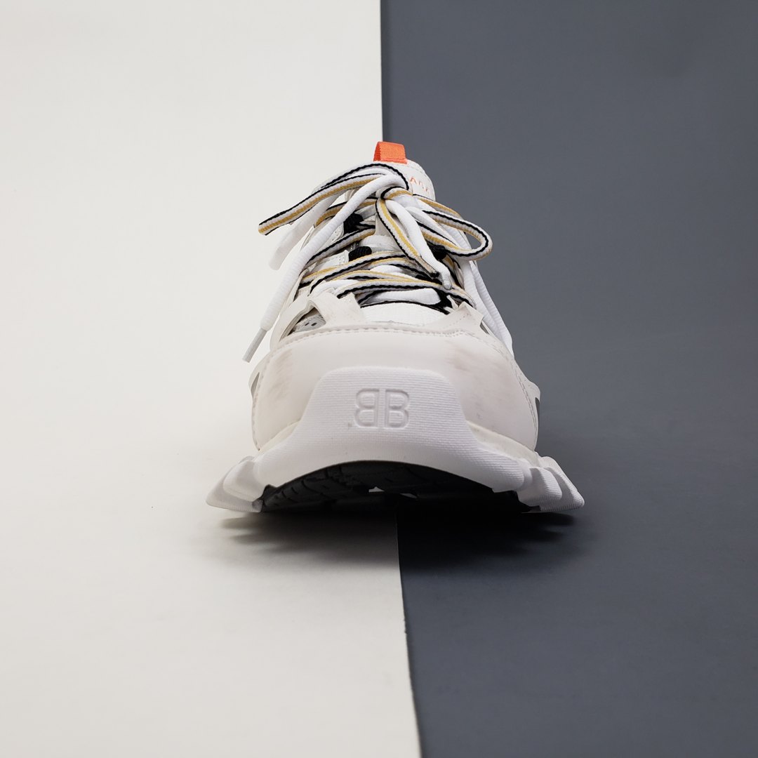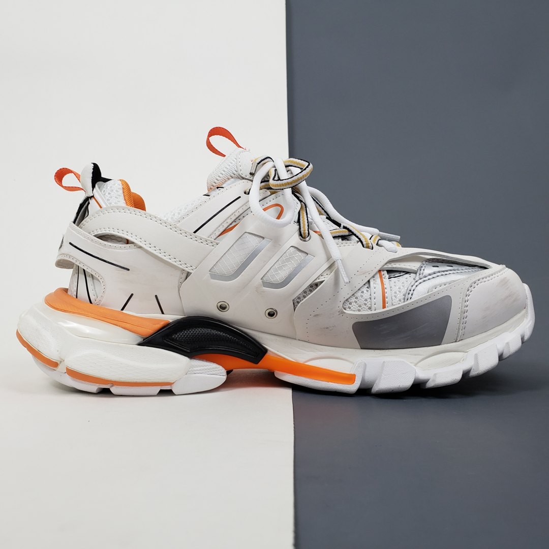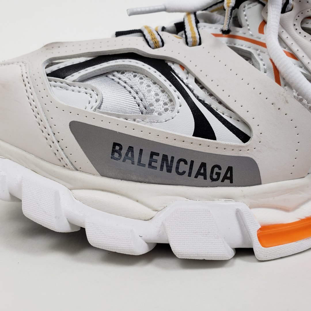 Официально дебютировавшие в сентябре 2018 года, кроссовки Balenciaga Track Trainer впервые появился на парижских показах во время шоу осенью 2018 года. Обувь изготовлена из сетчатой верхней части, снабженной перекрывающимися защитными нейлоновыми панелями, которые прикреплены к двойной системе шнуровки. Повсюду появляется брендинг Balenciaga, в то время как европейский размер кроссовок отмечен на носке. Уникальная обувь дополнена скульптурной подошвой. Изделие поставляется с чехлом для хранения и коробкой Balenciaga.- Цвета: White/Orange