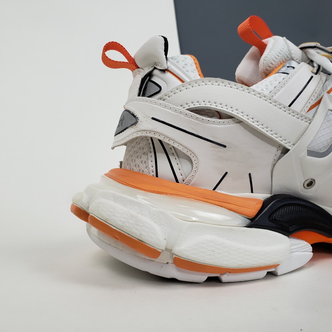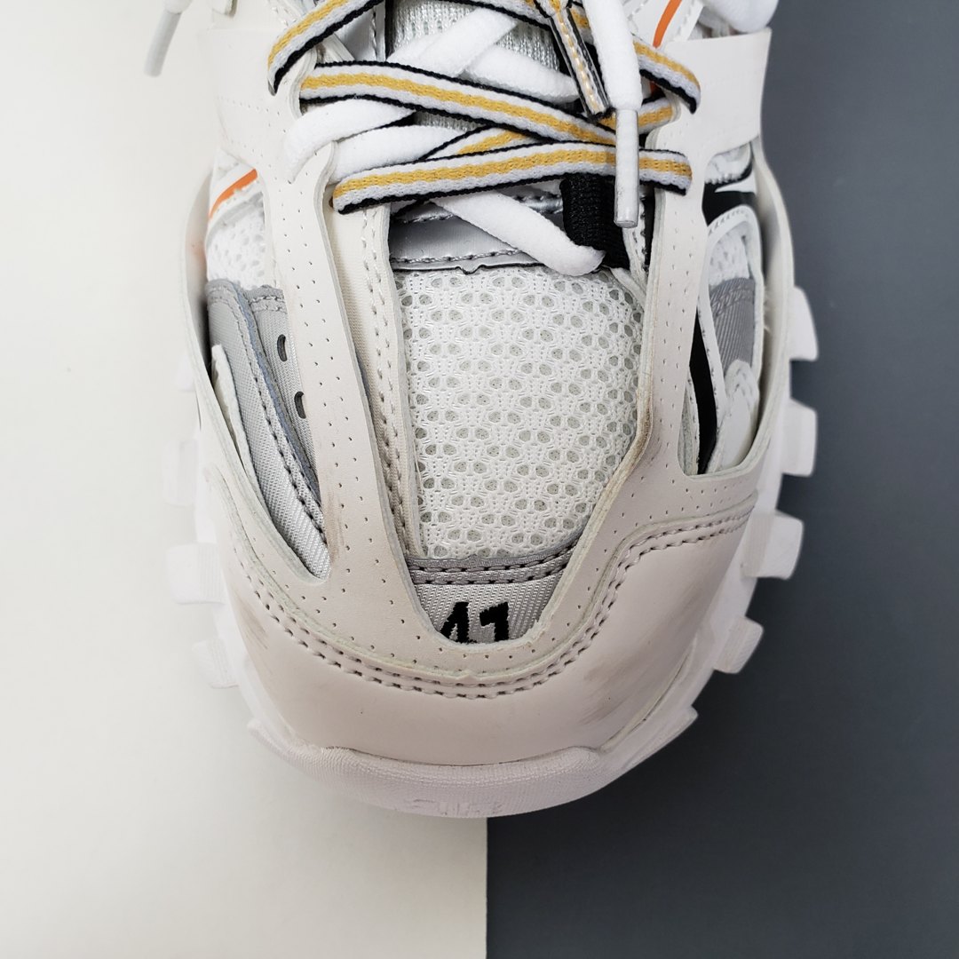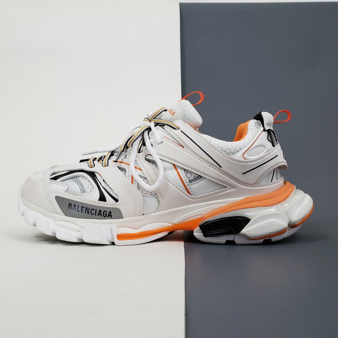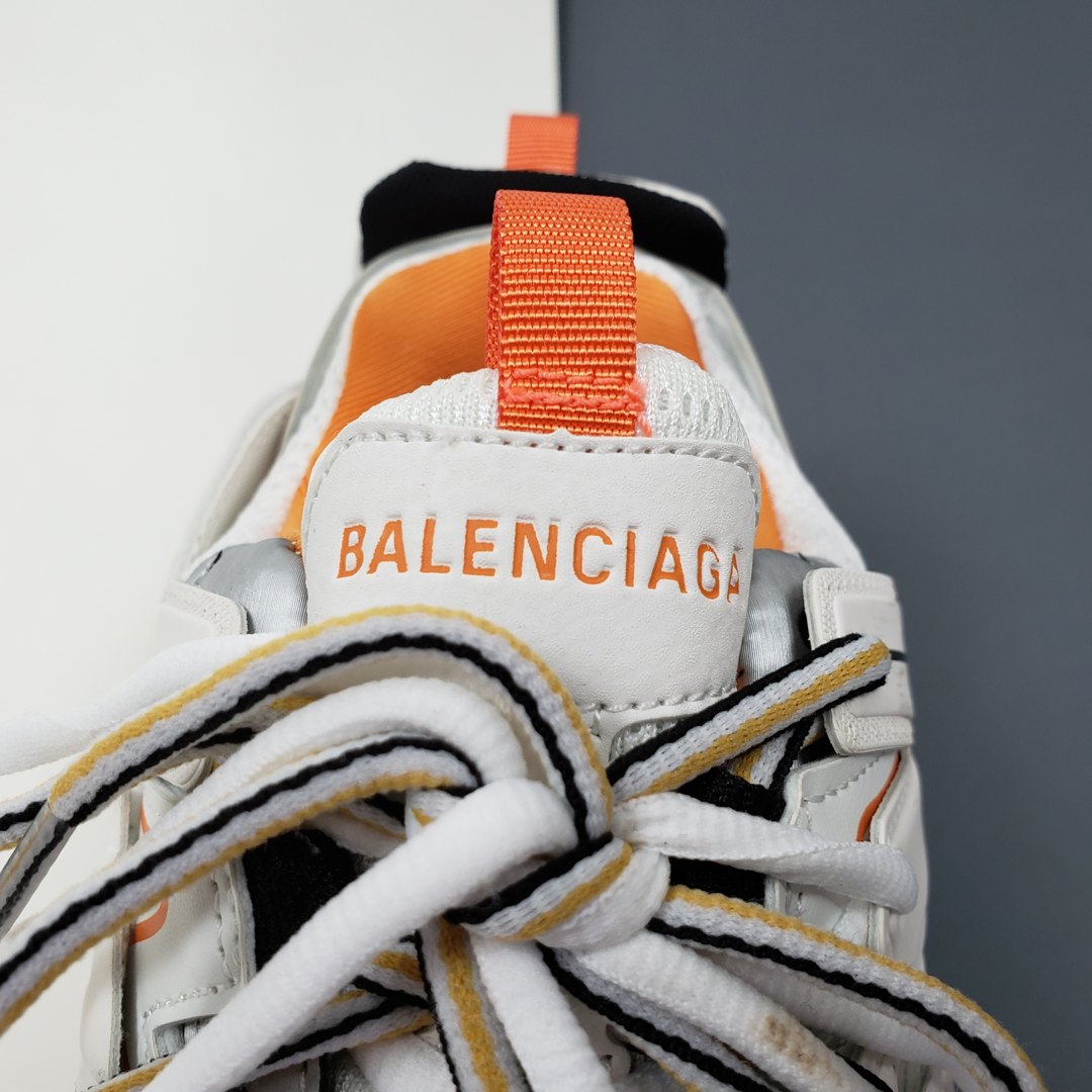 Официально дебютировавшие в сентябре 2018 года, кроссовки Balenciaga Track Trainer впервые появился на парижских показах во время шоу осенью 2018 года. Обувь изготовлена из сетчатой верхней части, снабженной перекрывающимися защитными нейлоновыми панелями, которые прикреплены к двойной системе шнуровки. Повсюду появляется брендинг Balenciaga, в то время как европейский размер кроссовок отмечен на носке. Уникальная обувь дополнена скульптурной подошвой. Изделие поставляется с чехлом для хранения и коробкой Balenciaga.- Цвета: White/Orange