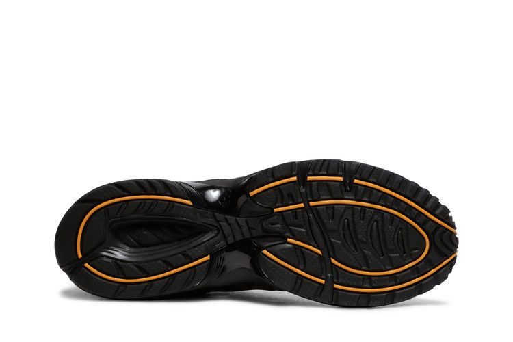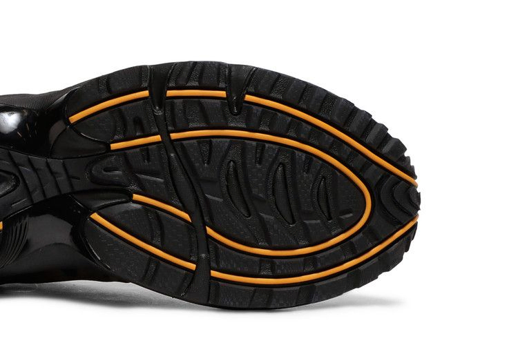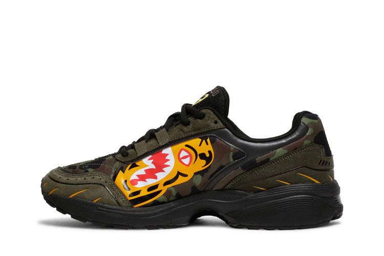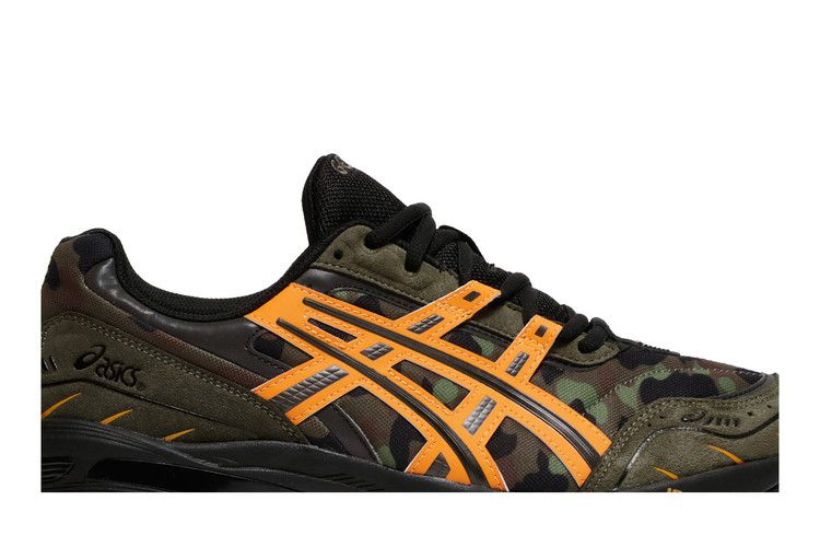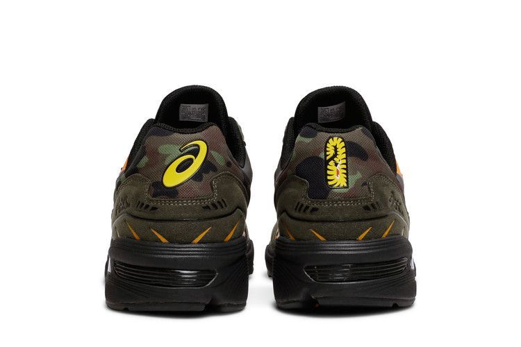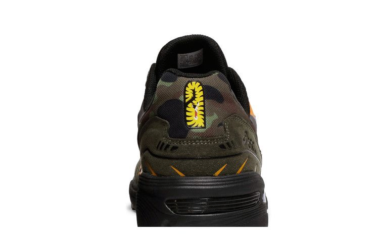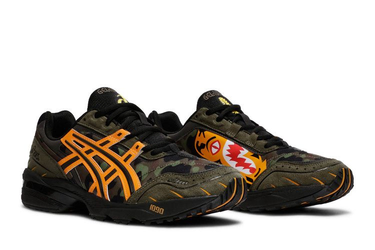 Модель BAPE x ASICS Gel 1090 'Camo' демонстрирует фирменные черты японского бренда уличной одежды. Ретро-кроссовки 2003 года выпуска выполнены из текстиля с камуфляжным принтом в сочетании коричневого, зеленого и черного цветов. Оливковые замшевые накладки расположены на передней части стопы и пятке, а четверть панели украшена ярко-оранжевыми тигровыми полосами на боковой стороне и мотивом BAPE "Тигровая акула" на медиальной стороне. Кроссовки опираются на сплошную черную промежуточную подошву из ЭВА с гелевой амортизацией в пятке для лучшей защиты от ударов.