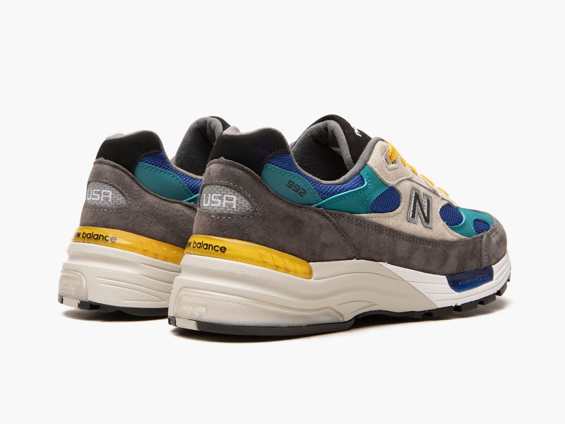 Модель Billy's x New Balance 992 Made in USA Grey Blue Teal состоит из синей сетки, замшевых накладок из свиной кожи и разделена на три части. Язычок и пятка сочетают в себе черную замшу с серой сеткой и темно-серой подкладкой, в то время как на средней панели преобладает светло-серая замша. Ярко-желтые шнурки сочетаются с логотипом New Balance.- Цвета: Grey/Blue/Teal/Yellow/White