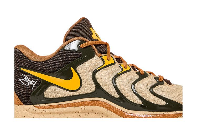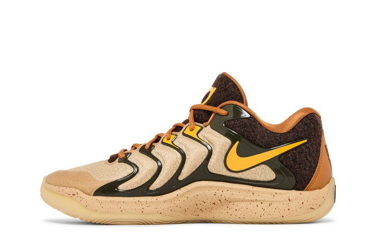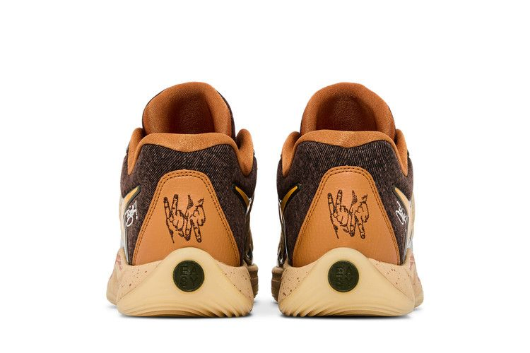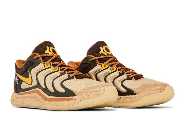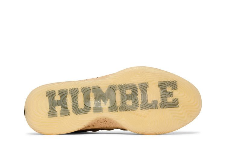 Эти Nike KD 17 - совместный релиз с хип-хоп продюсером Bink! Текстильный верх песочного цвета с глянцевым черным каркасом из TPU интегрирован в систему шнуровки. Надпись "Bink!" расположена на боковой стороне пятки, выполненной из узорчатого коричневого текстиля, в то время как на кожаной накладке цвета загара, укрепляющей заднюю часть пятки, изображена графика в виде простроченных рук. Коричневые детали покрывают легкую межподошву из пеноматериала, поддерживаемую полупрозрачной резиновой подошвой с надписью "HUMBLE", выполненной крупным шрифтом.