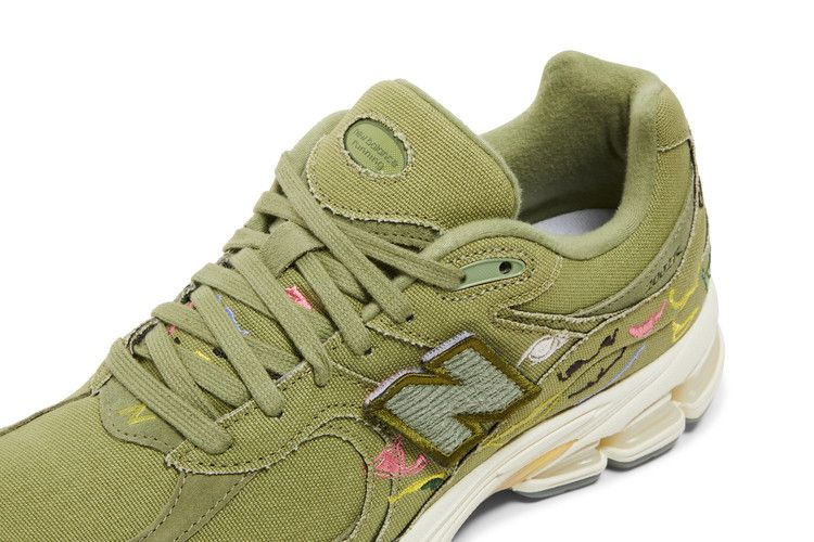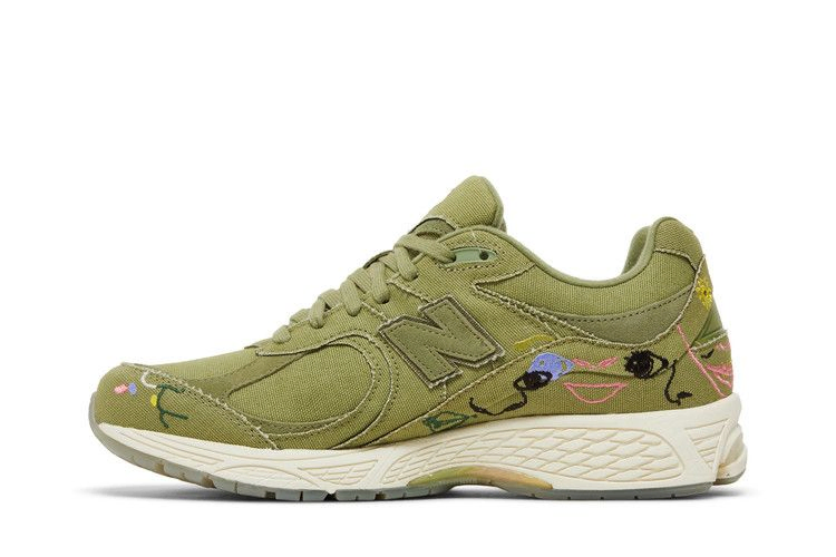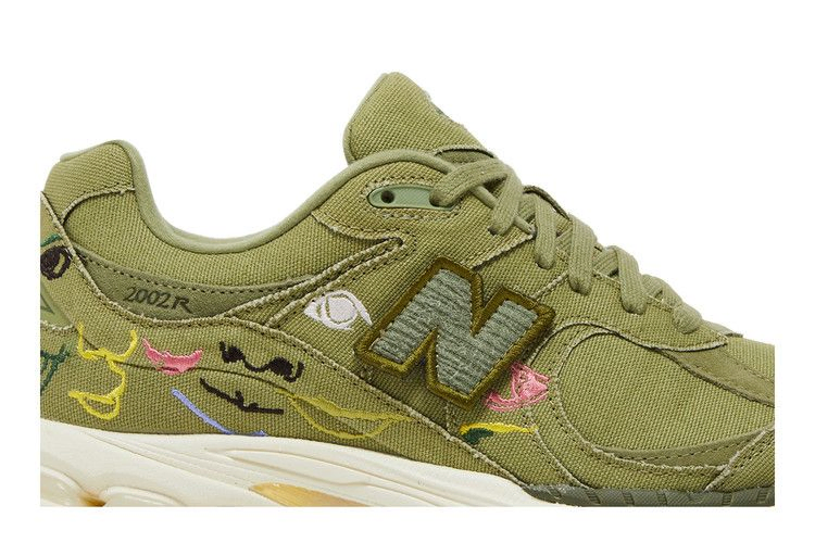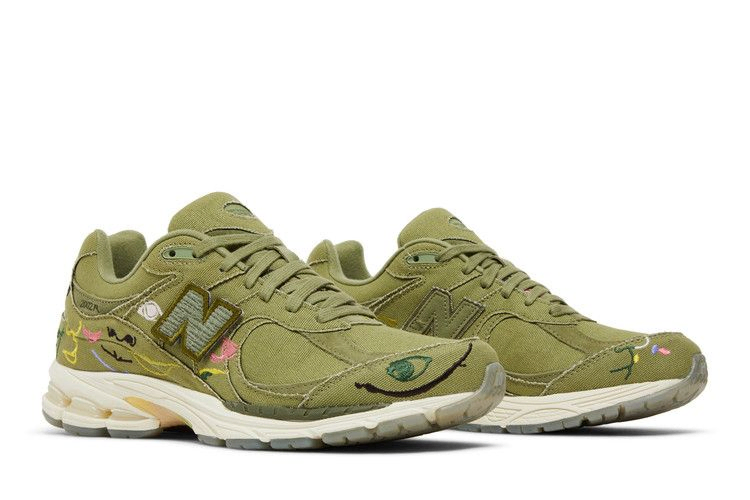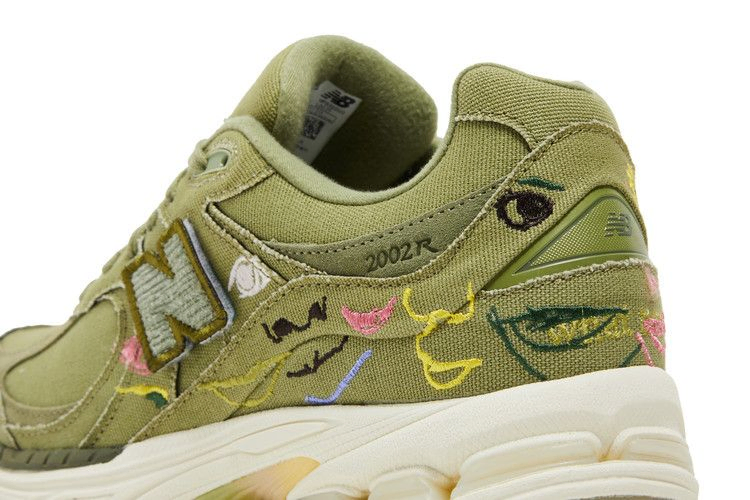 Модель Bryant Giles x New Balance 2002R "What Now?" представляет собой стилизованный подход художника из Лос-Анджелеса к бегу в стиле ретро. Оливково-зеленый оттенок нанесен на моющийся холщовый верх с обтрепанными краями и вышитыми рисунками Джайлса. Сменные логотипы на липучках 'N' украшают четверть панели, а на пятке красуется надпись "What Now?" - это намек на персональную выставку художника в 2021 году. Кроссовки установлены на промежуточную подошву N-ergy от New Balance, оснащенную амортизацией пятки ABZORB и поддерживаемую полупрозрачной резиновой подошвой.