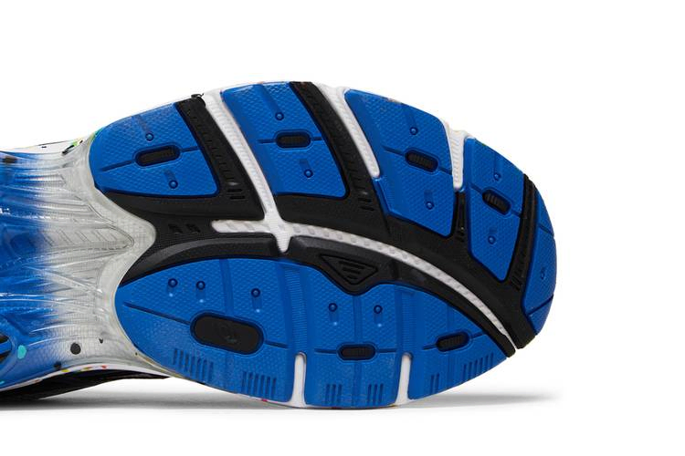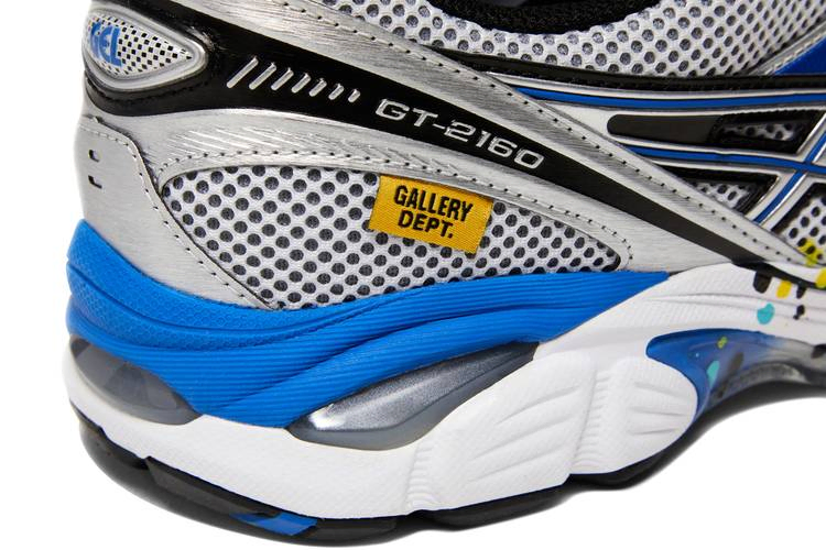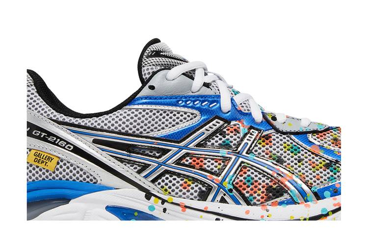 Эксклюзивные кроссовки Gallery Dept. x ASICS GT 2160 'ComplexCon Exclusive' украшены разноцветными брызгами краски на верхней части, изготовленной из белой сетки с открытыми ячейками и накладками из искусственной кожи синего и серебристого цвета. Боковую пятку украшает тканая бирка Gallery Dept. Мотив брызг краски продолжается на легкой промежуточной подошве из ЭВА, оснащенной видимой амортизацией GEL в пятке для защиты от ударов и плавного хода.