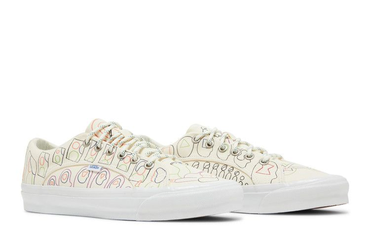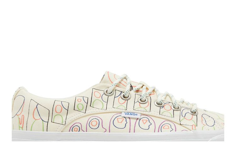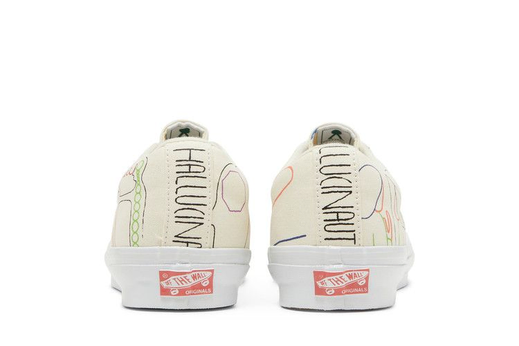 Модель Geoff McFetridge x Vans Vault OG Lampin LX 'Hallucinaut', созданная в рамках совместной коллекции с художником из Лос-Анджелеса, отличается текстильным верхом кремового цвета, покрытым уникальными набросками, нарисованными от руки между левой и правой частью обуви. Детали включают веревочные шнурки в крапинку, металлические люверсы и надпись "Hallucinaut", сделанную от руки на пятке. Кроссовки стоят на белой вулканизированной резиновой подошве, укрепленной подошвой из резины с вафельным рисунком.