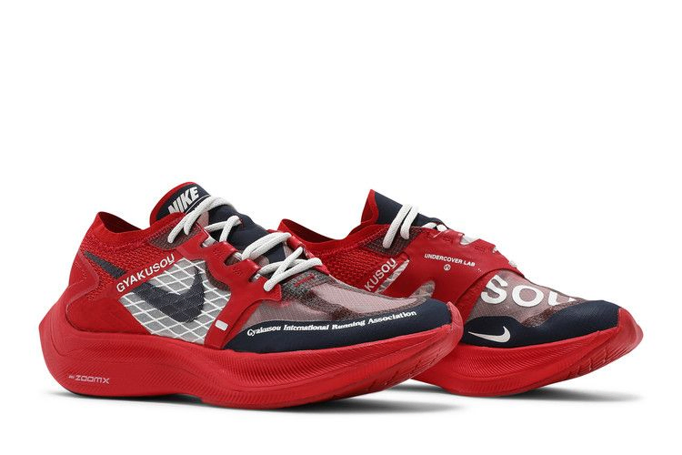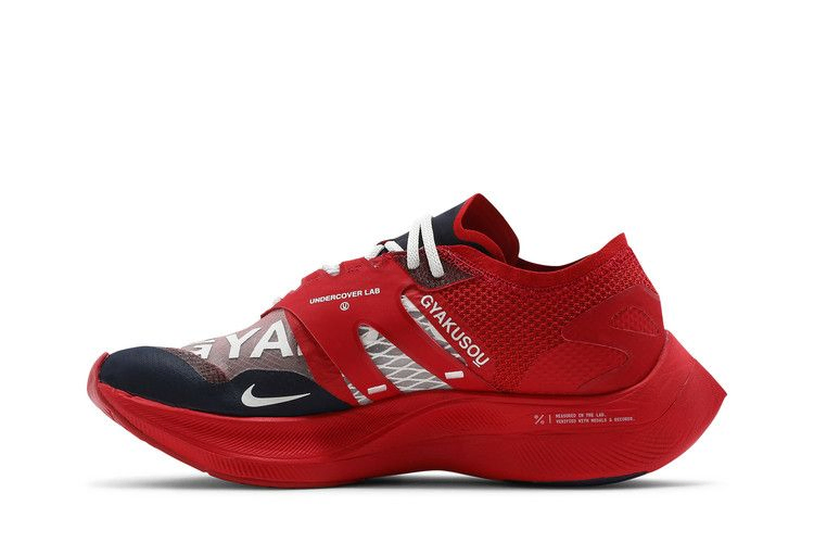 Модель Gyakusou x Nike ZoomX Vaporfly NEXT% "University Red Blue", созданная в сотрудничестве с токийской командой бегунов Jun Takahashi, демонстрирует яркий красный оттенок подошвы из вспененного материала ZoomX, а ее энергоотдачу усиливает пружинящая пластина из углеродного волокна. Сверху полупрозрачный материал FlyWeave дополнен синтетическими накладками без швов контрастного алого и темно-синего оттенков. Трикотажный воротник обеспечивает носочную посадку, а шнурки продеваются через боковые створки, что избавляет от необходимости использовать арку. Уникальный брендинг включает в себя надпись "Undercover Lab" на медиальном седле и "Gyakusou International Running Association" на боковой части передней части стопы.