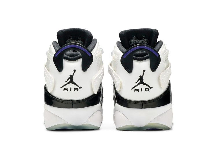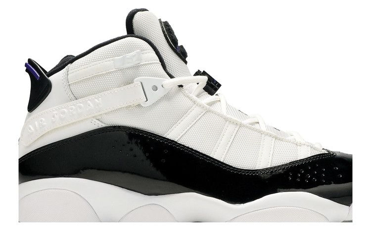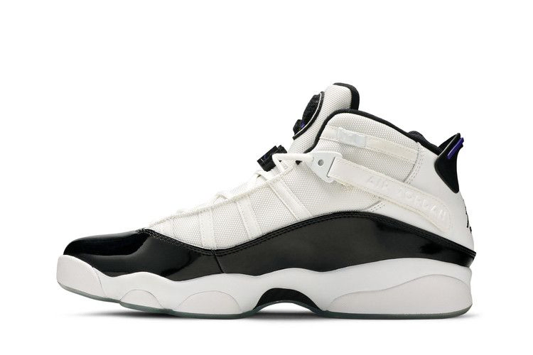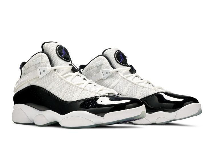 Выпущенные в октябре 2008 года кроссовки Jordan 6 Rings 'Concord' отдают дань уважения легенде Chicago Bulls, вбирая в себя элементы каждой из семи кроссовок, которые Майкл Джордан носил во время своего шестикратного чемпионства в НБА. Гибридные кроссовки имеют верх из белой галтованной кожи с черными лакированными панелями, сетчатыми накладками и акцентами Concord. Полноразмерная подошва Phylon оснащена блоком Zoom Air, который вместе с резиновой подошвой обеспечивает комфорт и долговечность.