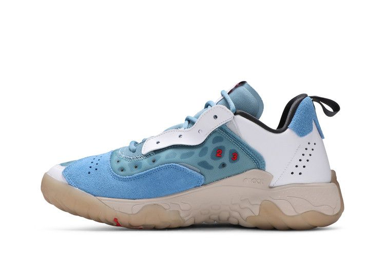 Модель Jordan Delta 2 "Cerulean" сочетает в себе противоречивые черты силуэта, обеспечивающего комфорт и динамичный стиль. Верхняя часть кроссовок состоит из сетки акварельного цвета и контрастных накладок из белой кожи и пудрово-синей замши. Тонкие вкрапления университетского красного цвета присутствуют в элементах брендинга кроссовок, включая тканый значок Jumpman и вышивку "23" на медиальной четвертной панели. Стелька из литого TPU уступает место промежуточной подошве Nike React, которая поддерживается полупрозрачными резиновыми накладками в местах повышенного износа.