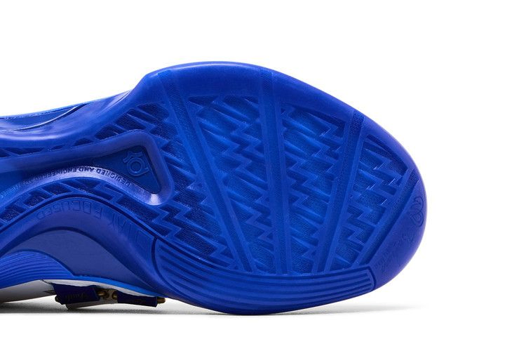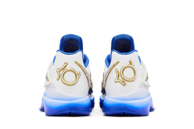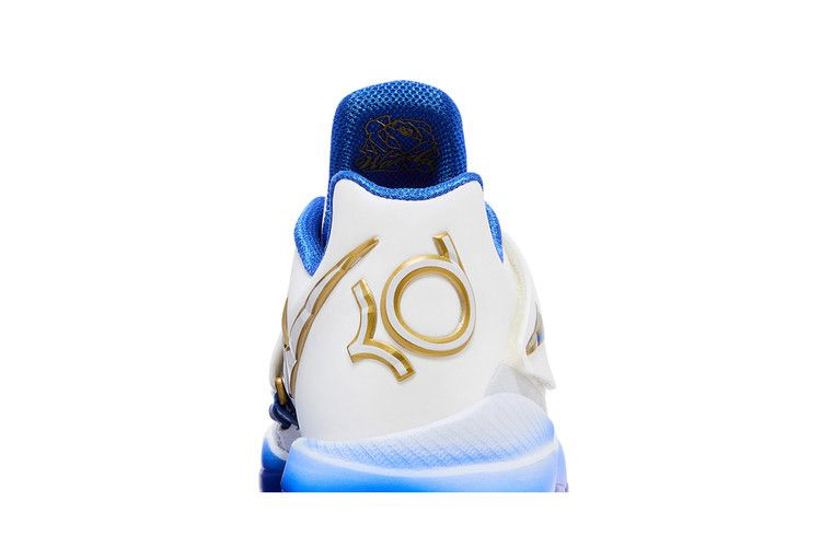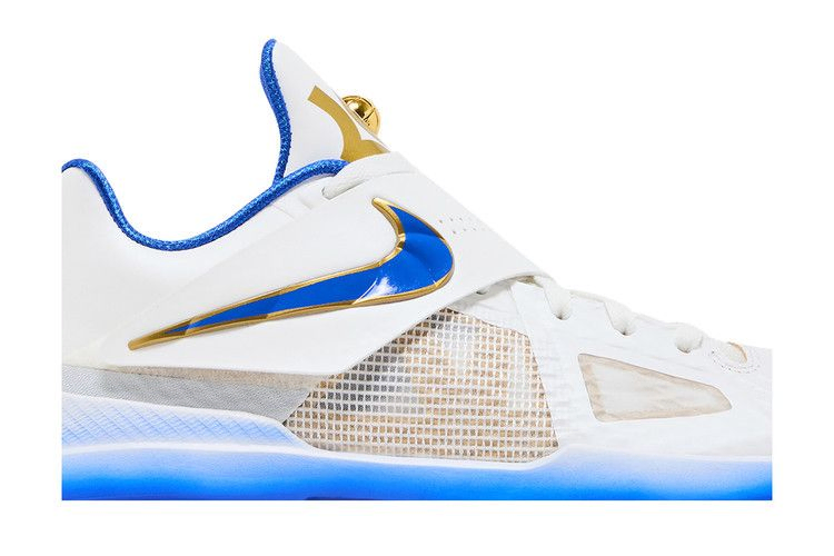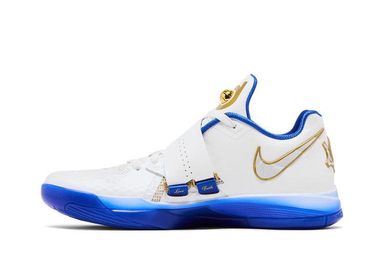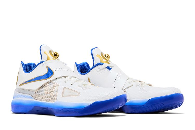 Nike Zoom KD 4 "The Real MVP - Summit White" - четвертые фирменные кроссовки Кевина Дюранта в специальной версии, посвященной MVP сезона 2013-14. Регулируемый ремешок фиксирует белый верх из сетки и искусственной кожи, подкладка из текстиля Hyper Royal и золотистые металлические акценты. На язычке расположен логотип KD с 3D-изображением баскетбольного мяча, взятого прямо с трофея MVP. Надпись "You the real MVP" ("Ты настоящий MVP") расположена на носочной части, что указывает на искреннее послание Кевина своей матери Ванде. Градиентная синяя отделка нанесена на легкую промежуточную подошву Phylon с амортизацией Zoom Air в передней части.- Артикул: IB3546-100