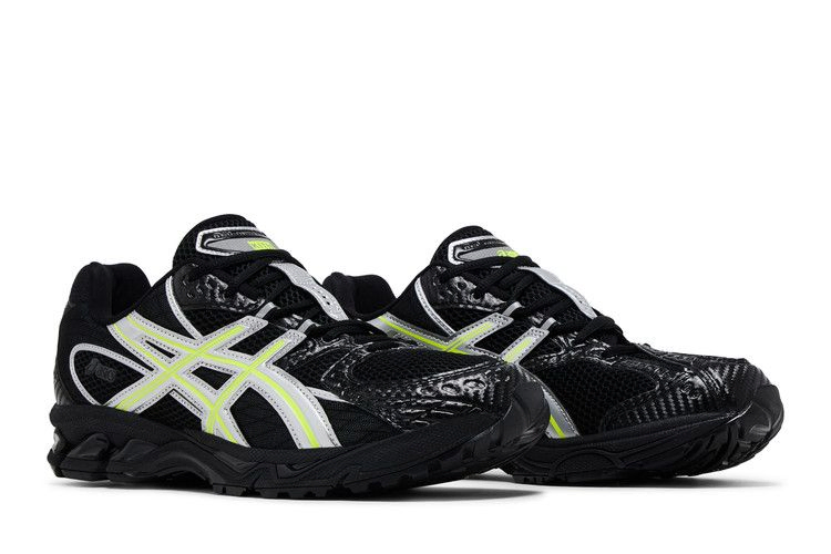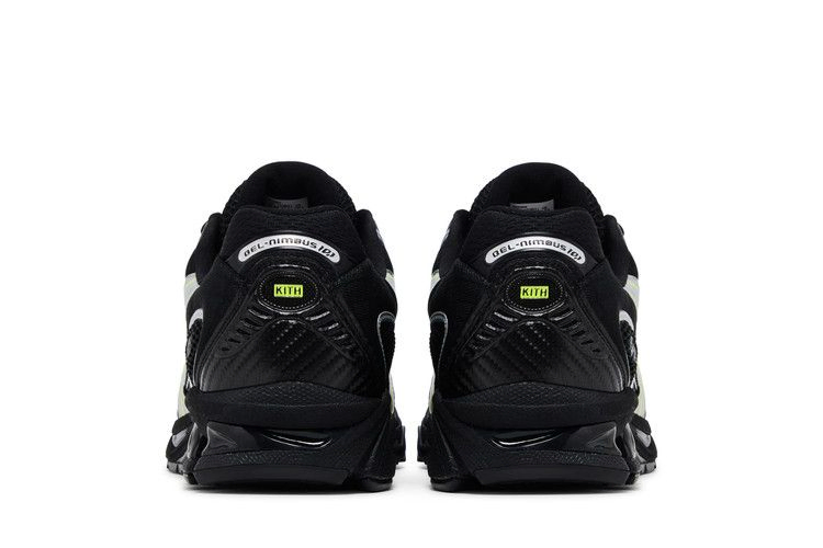 Модель Kith x ASICS Gel Nimbus 10.1 "Black Pure Silver" украшена неоново-зелеными тигровыми полосами с серебристой металлической окантовкой. Они выделяются на фоне дышащего черного сетчатого верха с усиленными деталями из углеродной синтетики на носочной части и пятке. Брендинг Kith и ASICS украшает боковую пятку левого и правого ботинка соответственно. Черная промежуточная подошва из ЭВА с видимой амортизацией Gel.