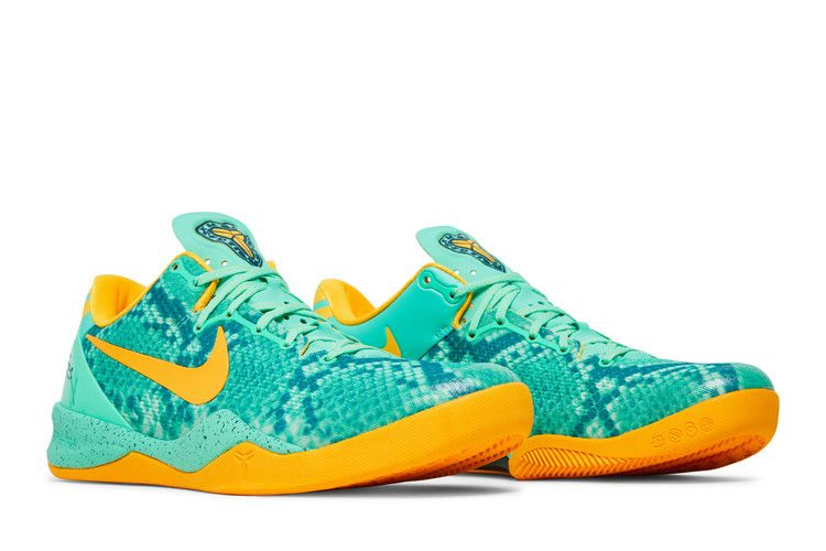 Очевидная рептилийная тема прослеживается в модели Nike Kobe 8 "Green Glow", выпущенной в декабре 2013 года. На язычке изображена змея, обвивающая личный логотип Коби, а змеиный принт, выполненный в сочетании Green Glow и Mineral Teal, покрывает верх из сетки Engineered Mesh. Контрастная расцветка представлена элементами брендинга и подошвой цвета Laser Orange.