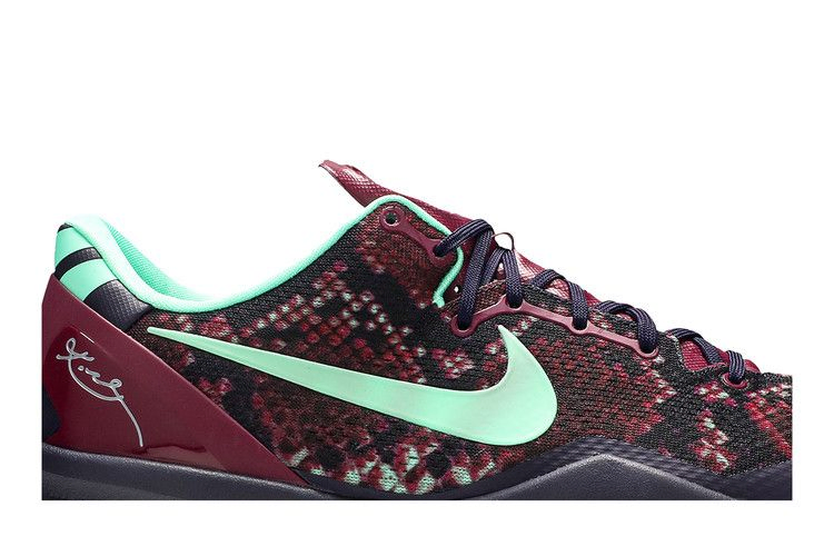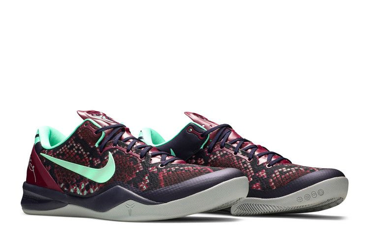 Модель 2013 Kobe 8 "Pit Viper" имеет верхнюю часть из малиново-красной сетки Engineered Mesh, выполненную в стиле змеиной кожи. Контрастная зеленая расцветка появилась на логотипе Swoosh, пятке и подкладке, а фиолетовый цвет System Purple - на шнурках, стойке пятки и поддерживающем плавном слое на носке. Под ногами кроссовки с низким верхом оснащены промежуточной подошвой Lunarlon.