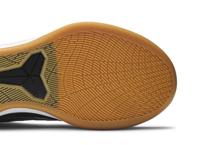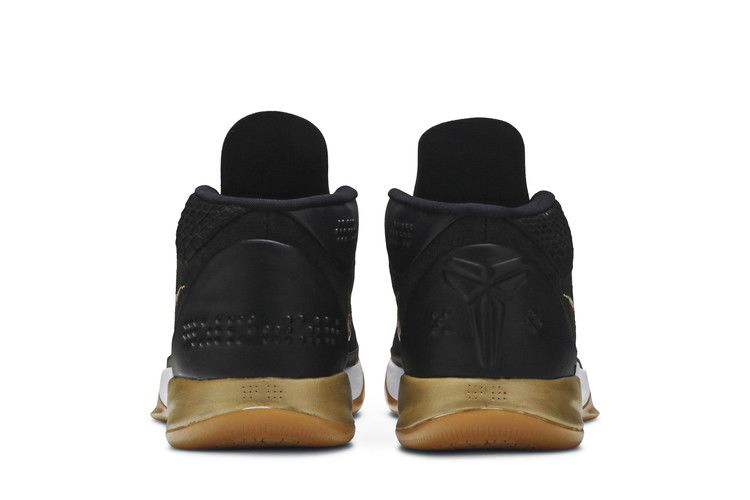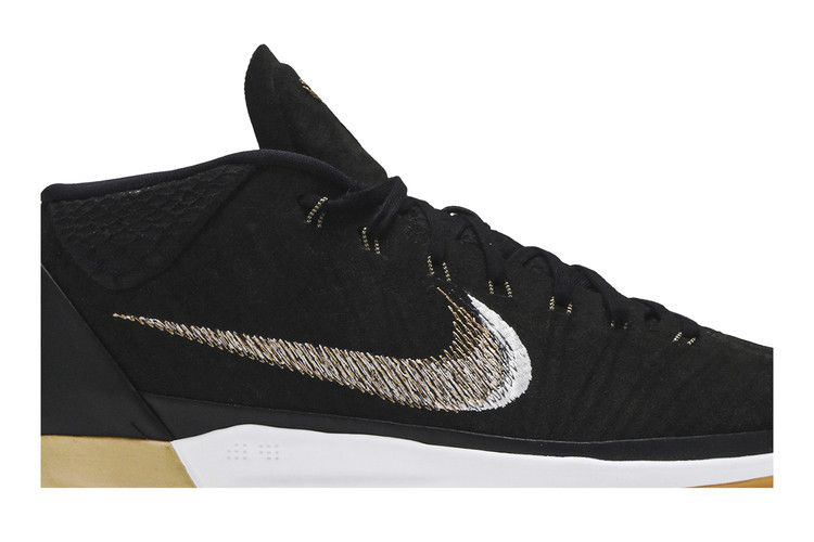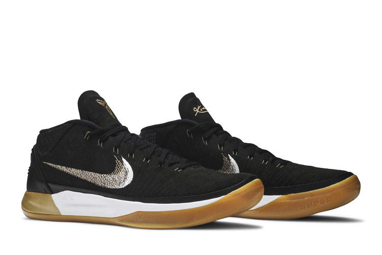 Модель Kobe AD "Black Gum" выполнена из гладкого черного материала Flyknit с золотыми акцентами на люверсах, брендинге и Swoosh. На белой межподошве контрастирует подошва из жвачки и дополнительные логотипы Mamba на язычке, пятке и стельке.
