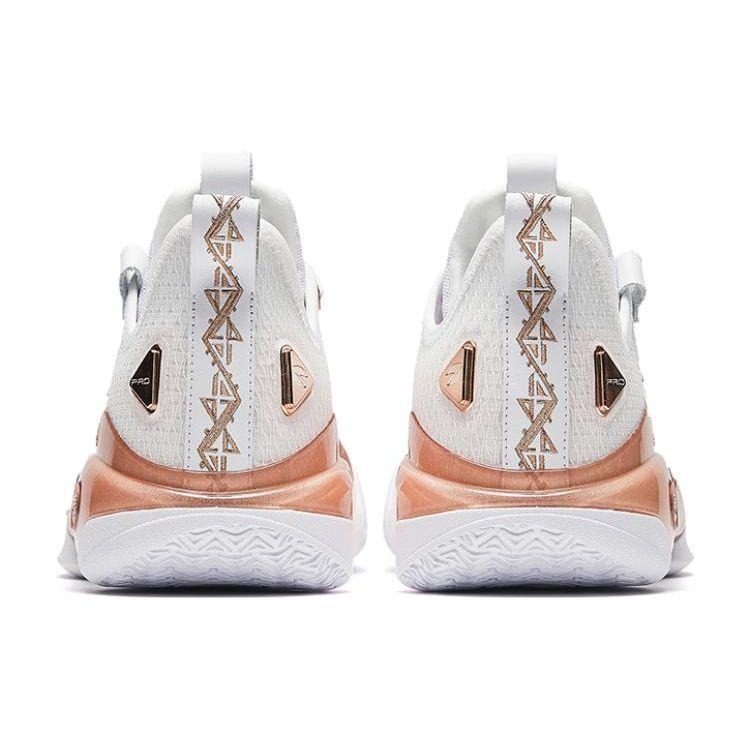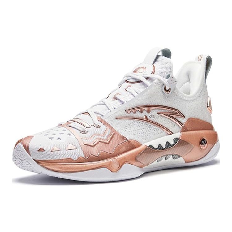 Вдохновением для этих кроссовок Kyrie Irving x Anta Shock Wave 5 Pro Finals служат свирепые хищники и пересеченная местность. Например, на боковой части мидсоли расположена TPU-панель, напоминающая рыбью кость и имитирующая кожу крокодила или кобры. Дышащий верх выполнен в цветовом сочетании белого и золотого, а неровные линии создают иллюзию зубов. Что касается технологий, то кроссовки оснащены полноразмерной промежуточной подошвой и стелькой Nitrogen, устойчивыми пластинами из TPU и карбоновой пластиной. Резиновая подошва слегка выступает над носком и выполнена из нескользящего материала.
